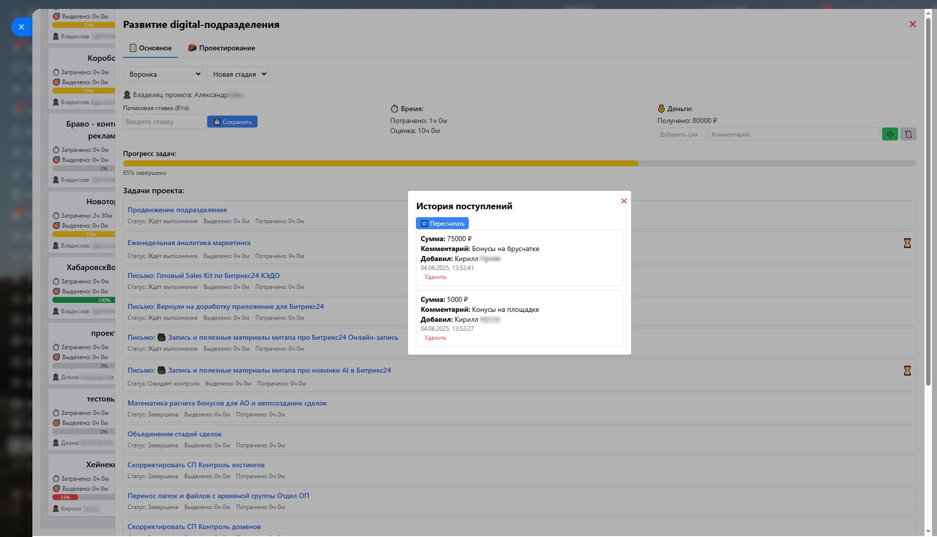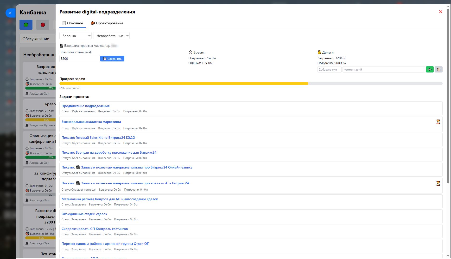 - Учёт времени и бюджета — отображение потраченного времени, запланированного времени, суммы поступлений, расчёт затрат на основе почасовой ставки.