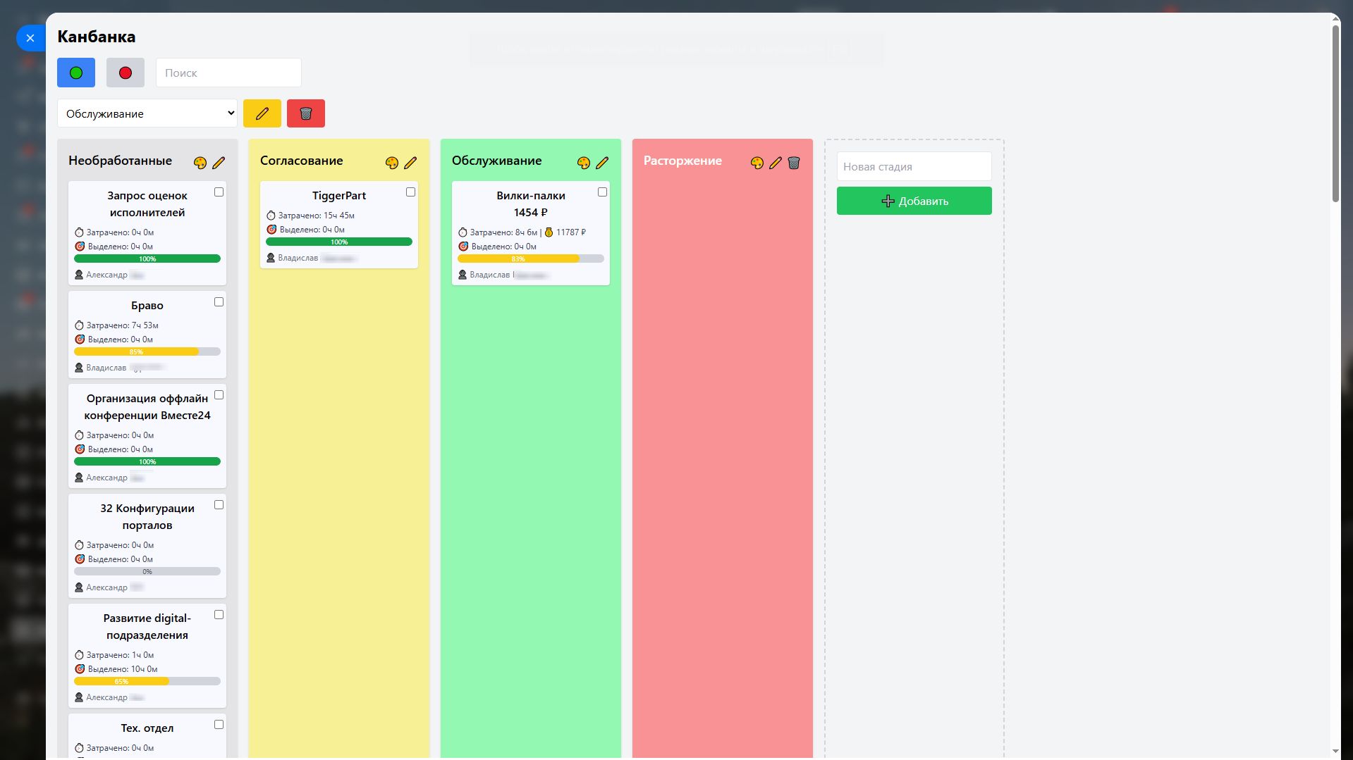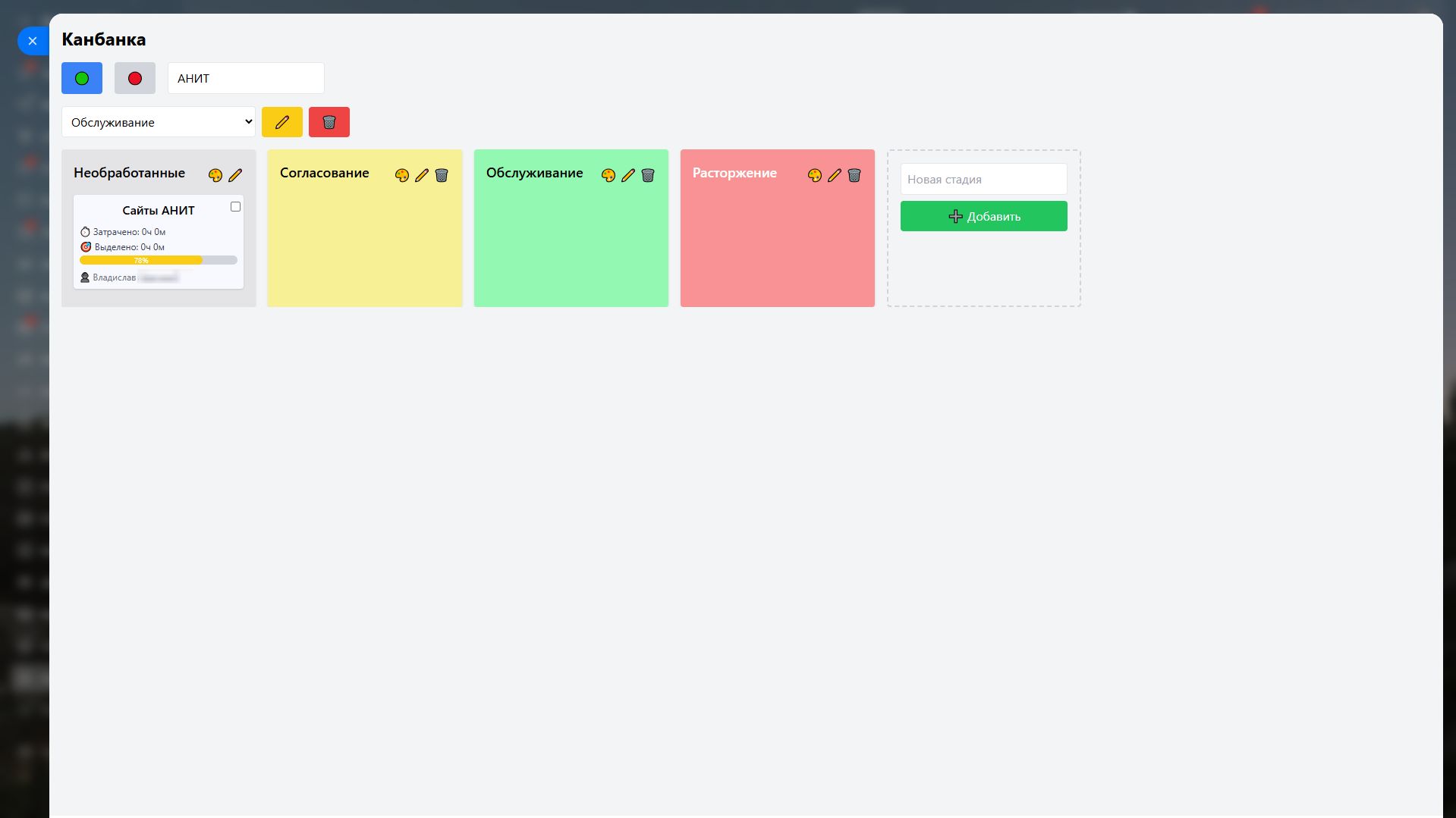 - Канбан-доска — визуальное представление проектов по стадиям с возможностью перемещать проекты, управлять воронками и стадиями, настраивать цвета и сортировку.