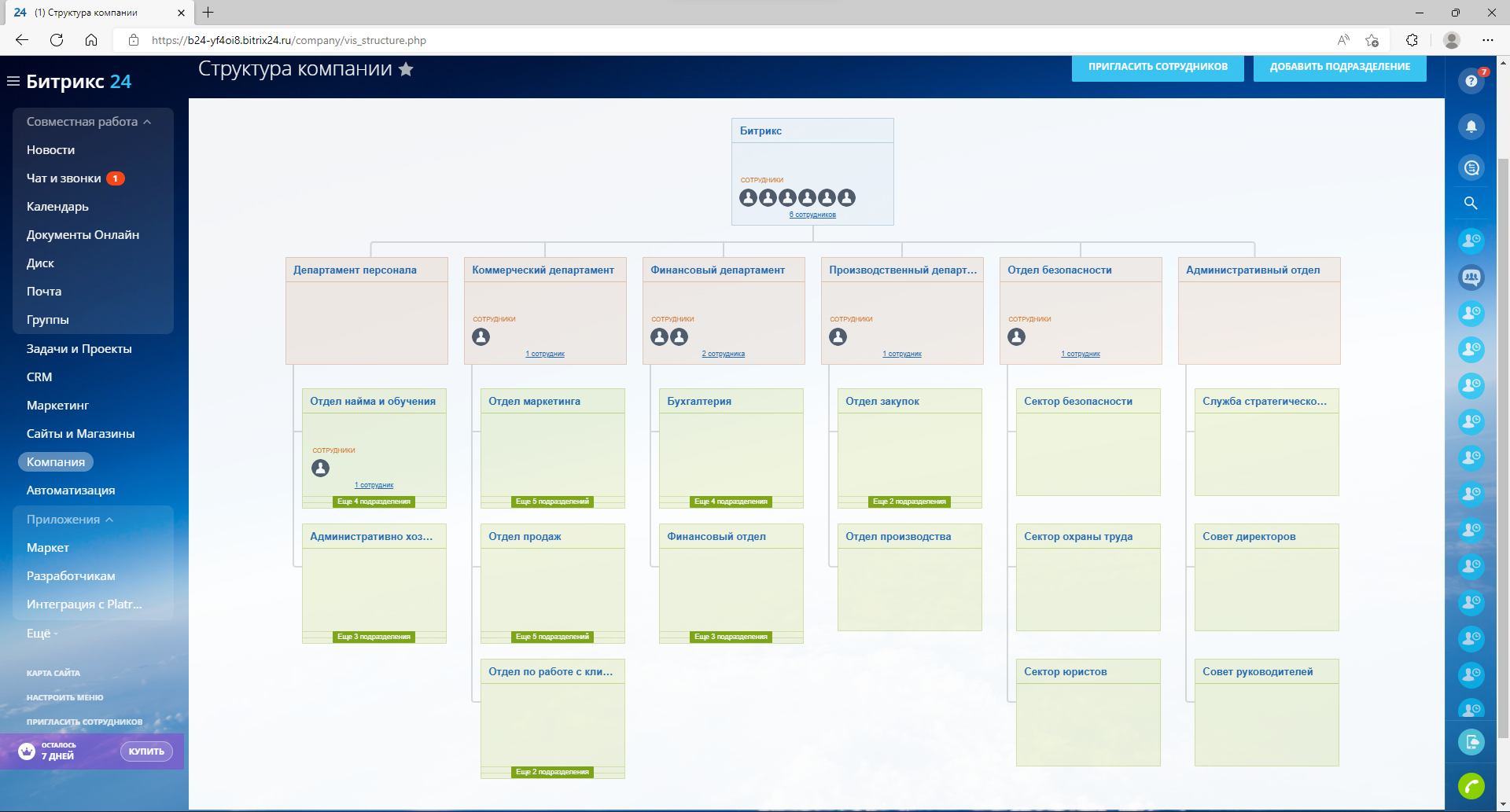 Поддерживается полный перенос структуры компании, включая иерархию подразделений и сотрудников. При синхронизации структуры отсутствующие на портале сотрудники будут автоматически приглашены в Битрикс24 по электронной почте.