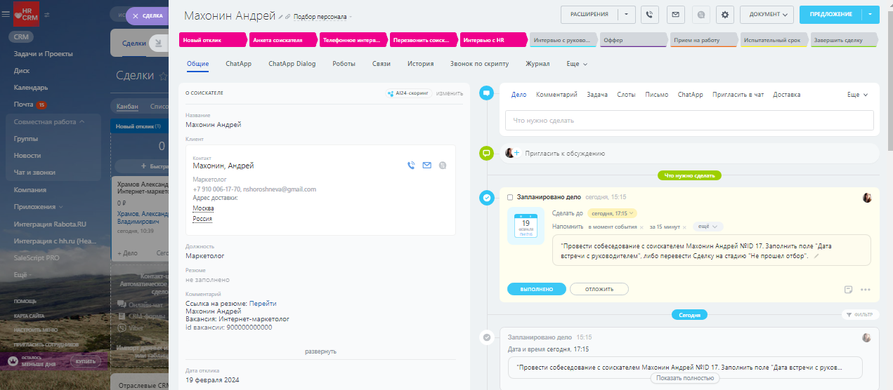 Телефонное интервью – на данную стадию приходит ответ на Анкету от соискателя. По итогу ознакомления с ответами соискателя HR связывается с кандидатом и назначает собеседование, заполняя поле – «Дата интервью с HR». После заполнения данного поля Сделка автоматически перейдет на стадию «Интервью с HR», а кандидату будет направлено уведомление на почтовый ящик и WhatsApp (если они подключены к СRM). Так же HR может завершить Сделку и перевести ее на одну из проигрышных стадий «Нецелевой», «Не прошел отбор». Соискателю автоматически уйдет сообщение на почтовый ящик и WhatsApp об отказе (если они подключены к СRM). Если в течение рабочего дня связаться с кандидатом не удалось, Сделка автоматически переходит на стадию «Перезвонить соискателю».;