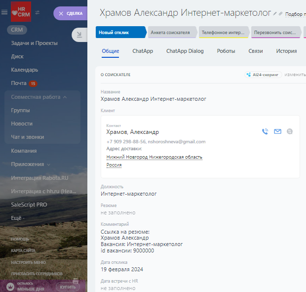 2. Для общения с соискателями рекомендуем подключить к порталу Битрикс24: