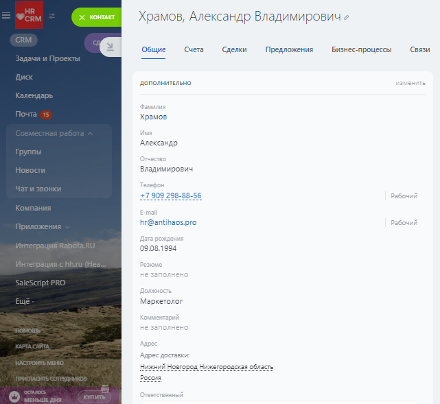 Так же мы адаптировали под работу менеджера по подбору персонала карточки Сделка и Контакт. Добавили такие поля как: