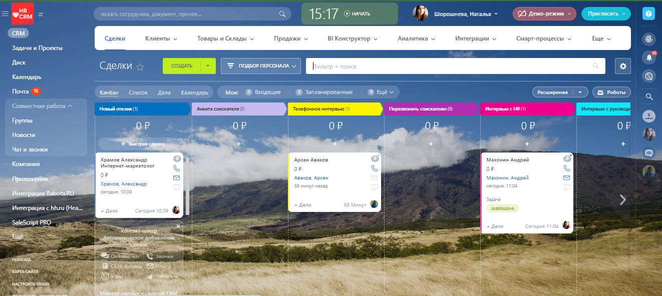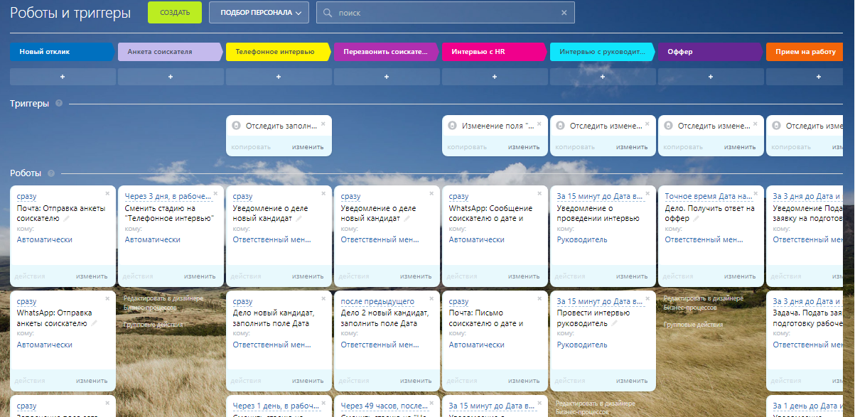 - Автосмена стадий воронки при выполнении запланированный дел HR и др.