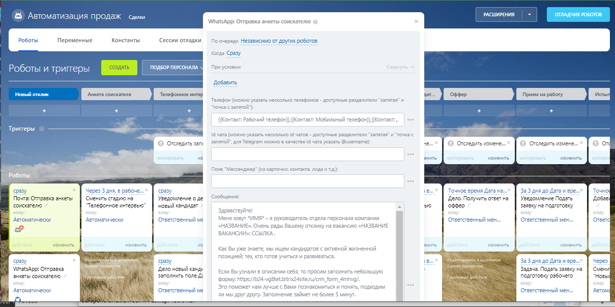 ВАЖНО! Без подключения ChatApp данный робот не сработает, соискатель не получит сообщение на WhatsApp.