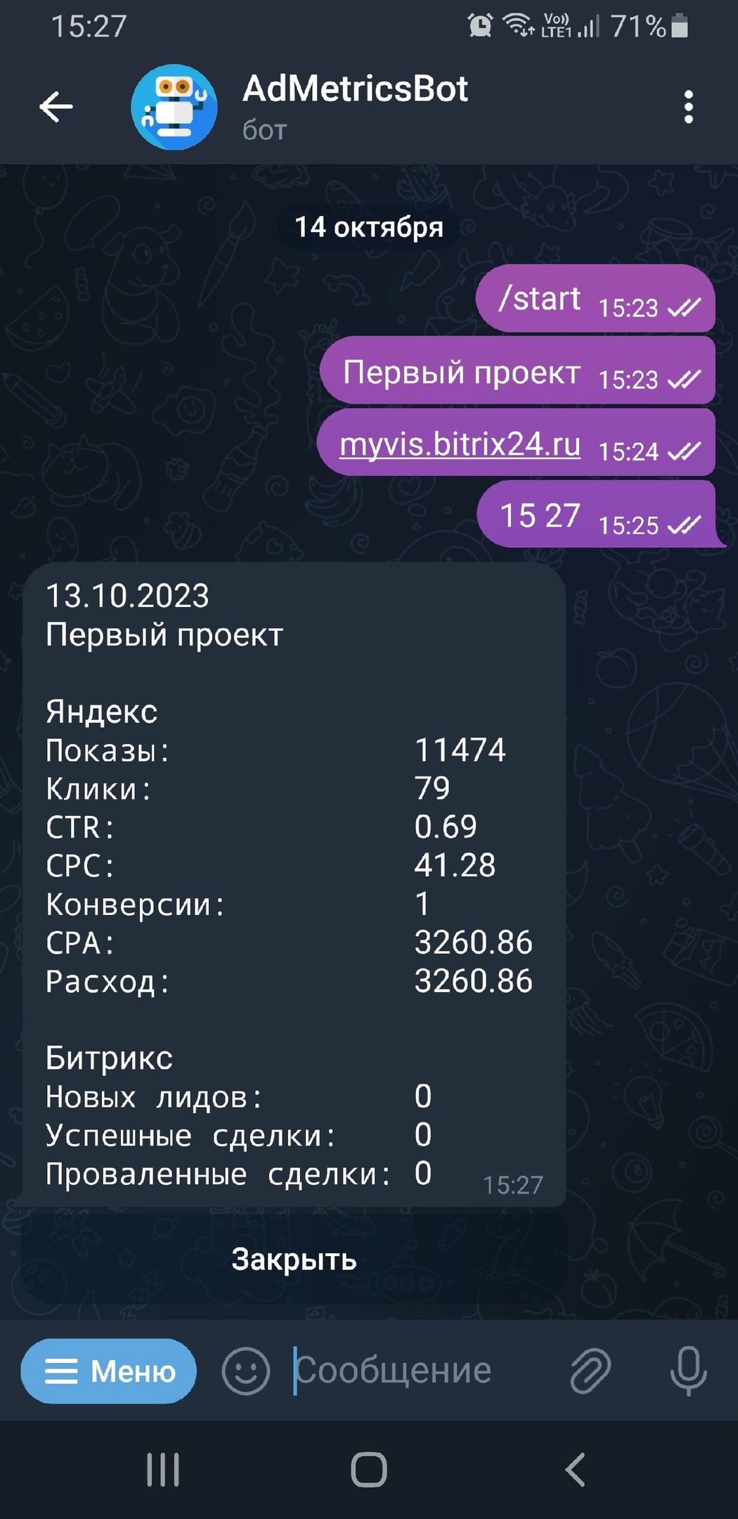 Приложение собирает данные по рекламным источникам и срм, после чего в заданное время регулярно отправляет сообщение с краткой статистикой по лидам и сделкам с помощью бота в Телеграм.