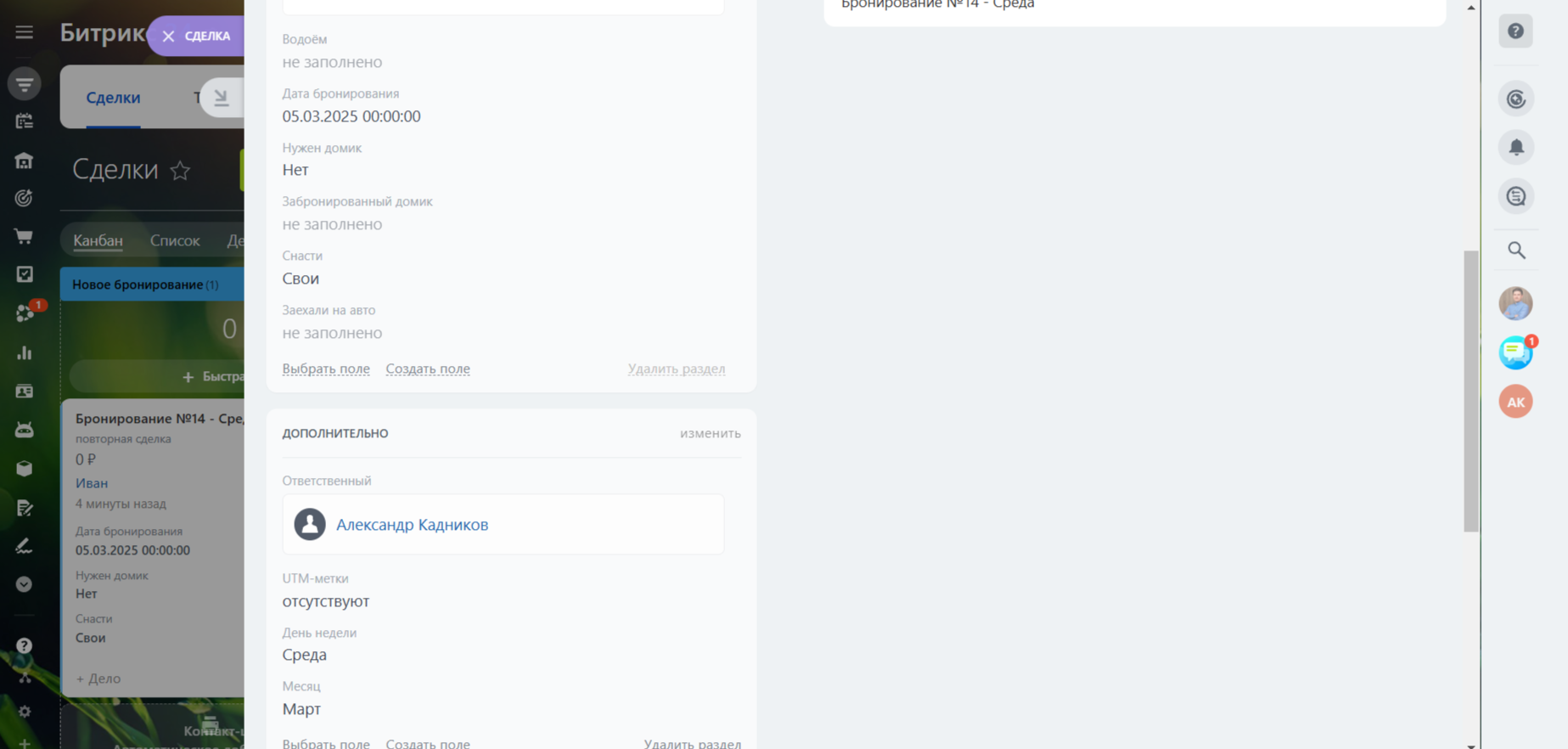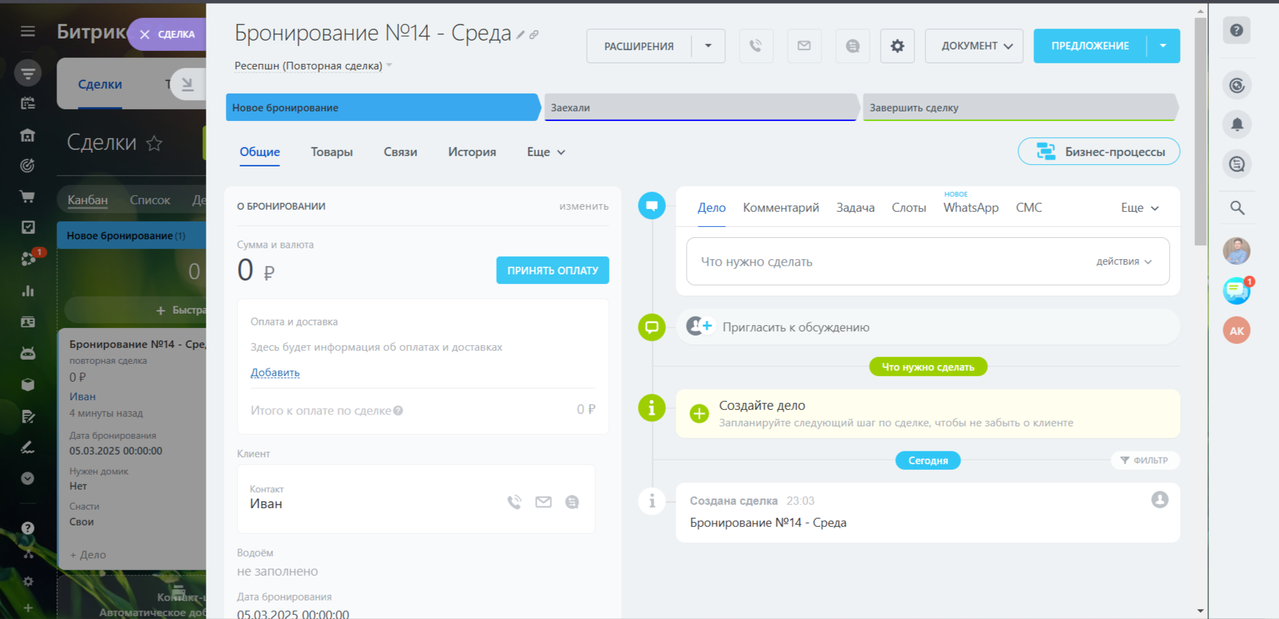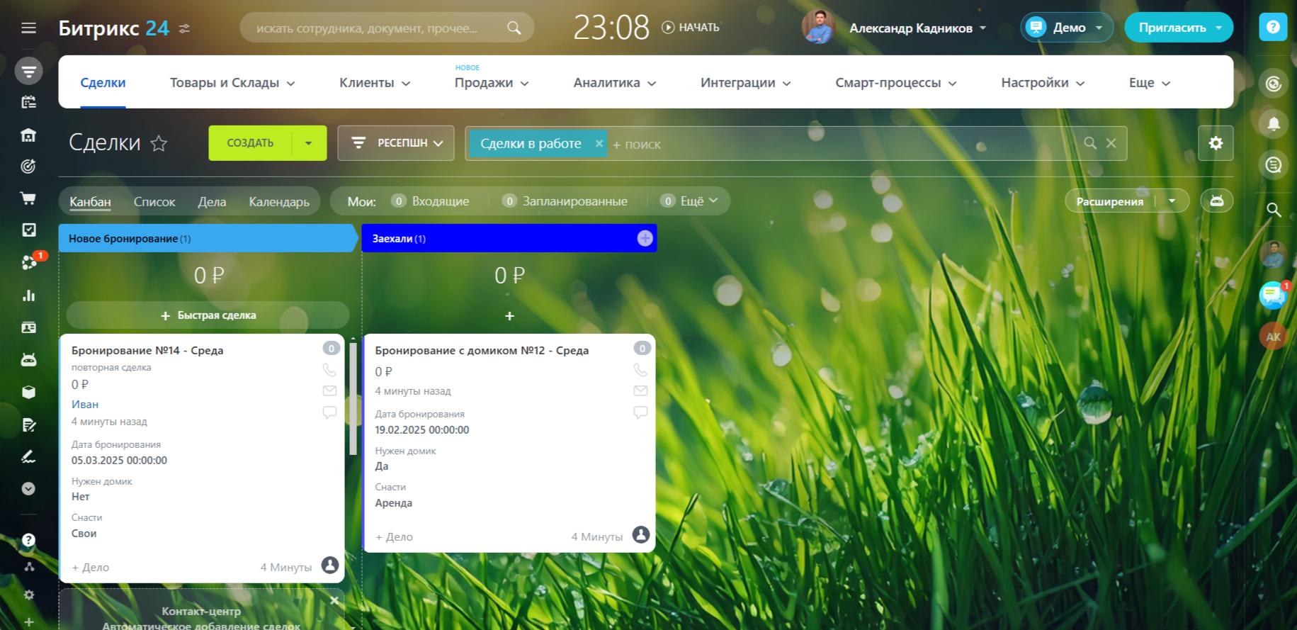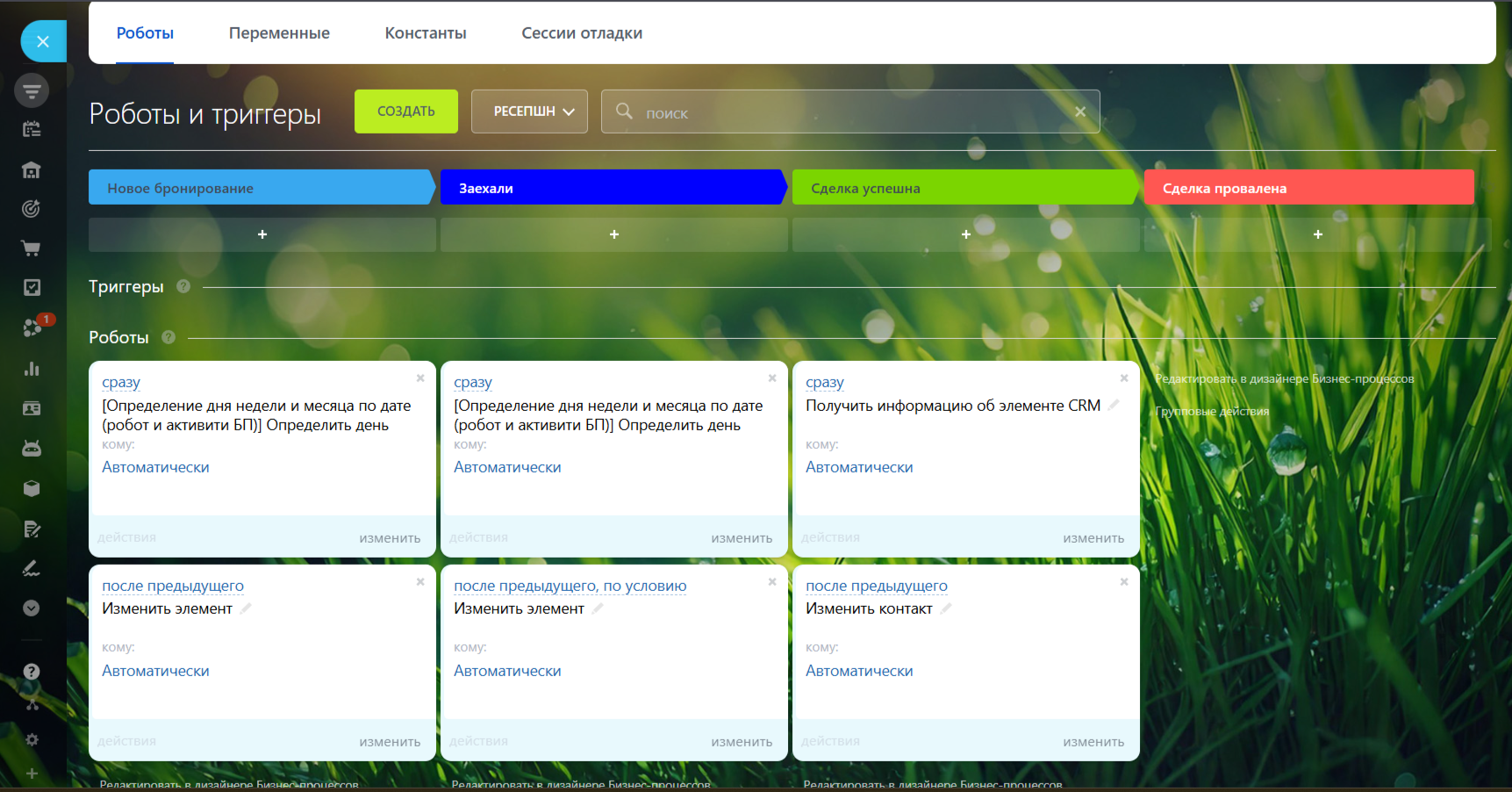 На второй стадии "Заехали" мы также установили два робота из предыдущей стадии, только на этой стадии система проверяет будет бронировать гость домик или нет, если да, то дописывает в название сделки "Бронирование с домиком". Опять же удобная настройка для быстрого поиска и визуального отображения, какие сделки с домиками, какие нет.