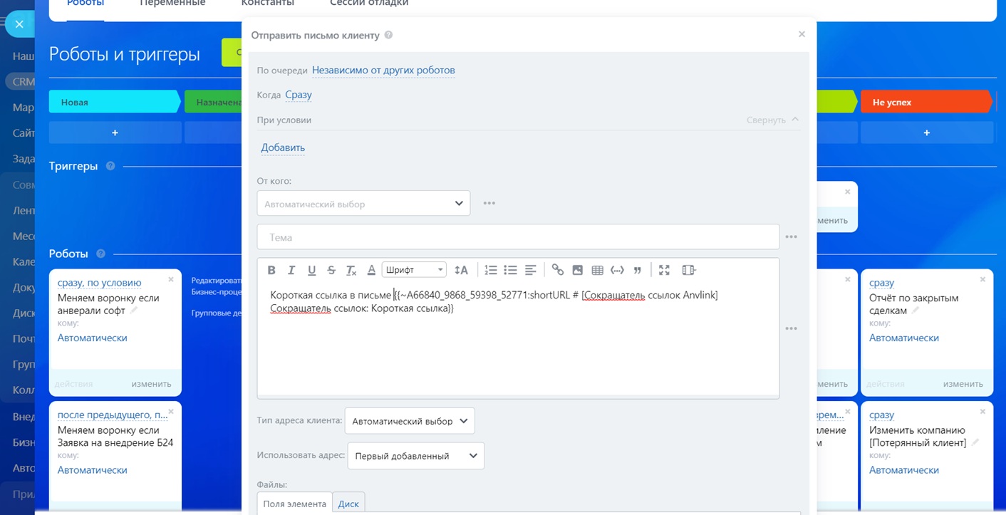 Добавьте робота сокращателя ссылок и укажите ссылку, которую необходимо сократить.