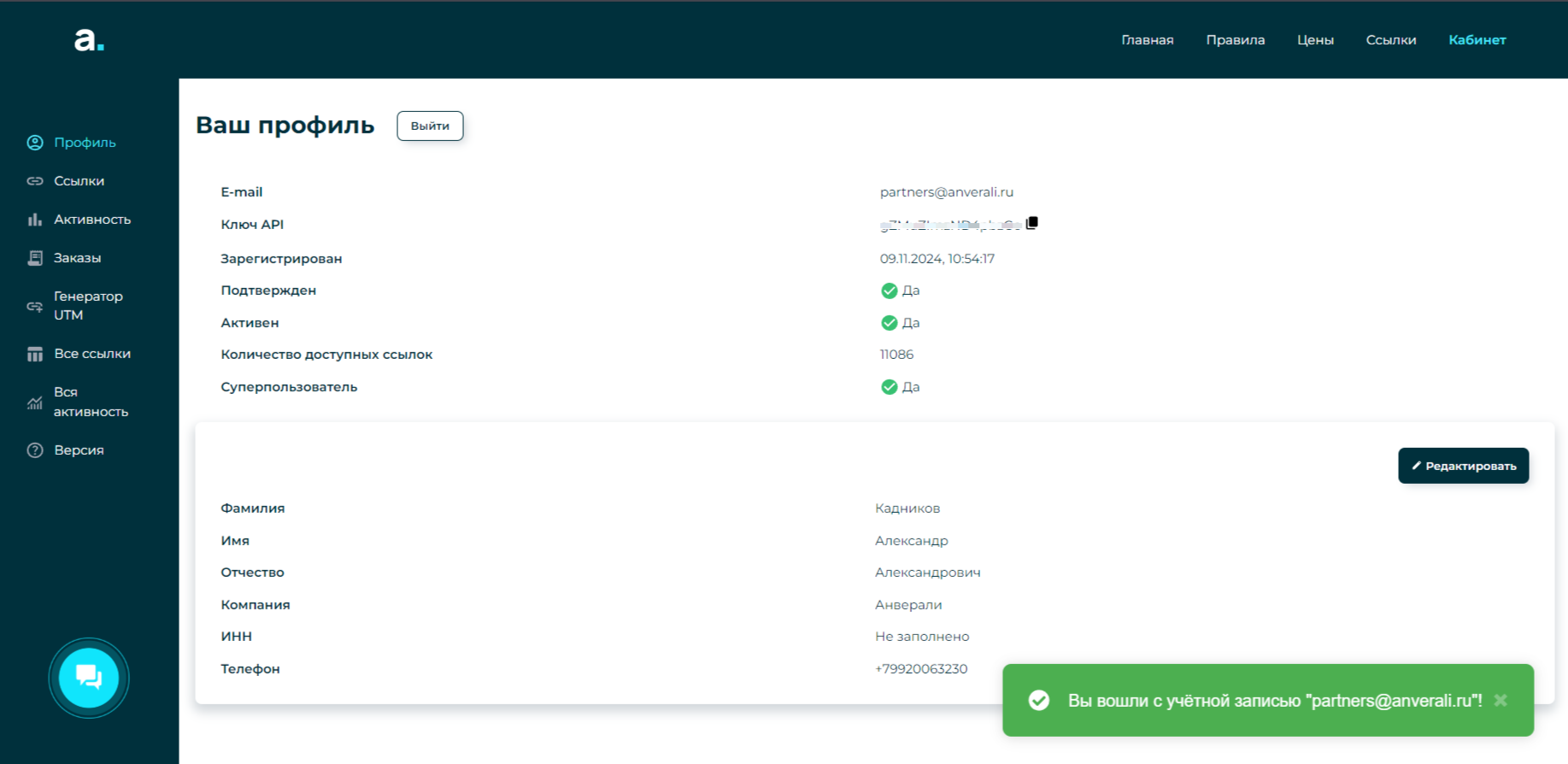 1. Регистрируетесь в личном кабинете на сайте anvlink.ru