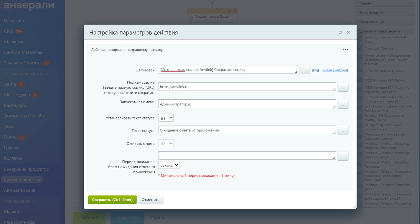 Приложение добавляет на портал робота и активити бизнес-процессов, при помощи которых можно сократить ссылку. Сокращение ссылки происходит через интеграцию с сервисом anvlink.ru. После установки вы получаете автоматизацию сокращения ссылок с аналитикой по каждой ссылке.