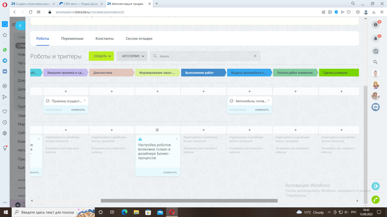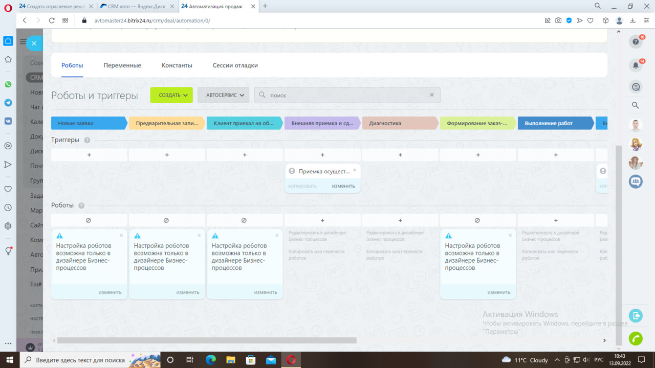 Первая стадия «Новые заявки», на данной стадии приходит уведомление ответственному менеджеру о необходимости взять в работу новую сделку и внести информацию по записи клиента в карточку. Как только будут внесены данные по предварительной записи клиента (дата и время записи), данная запись будет зафиксирована в календаре Автосервиса. Следующая стадия «Предварительная запись» - уведомление менеджеру о необходимости согласовать предварительную запись с клиентом. «Клиент приехал на обслуживание» - уведомление об этом ответственного менеджера. Далее идет стадия «Внешняя приемка и сдача на пост» - как только работник осуществит приемку, это необходимо зафиксировать в карточке сделки, сработает триггер и переведет карточку на стадию «Диагностика». Далее стадия «Формирование заказ-наряда» - уведомление менеджеру о необходимости сформировать заказ-наряд для клиента и отправить ему. Следующая стадия «Выполнение работ», на данной стадии необходимо отметить в карточке о готовности автомобиля к выдаче клиенту. Триггер переведет карточку на следующую стадию «Выдача автомобиля клиенту». Далее идет стадия «Оплата работ клиентом», «Сделка успешна» и неуспешные варианты сделок: «Качество работ не устроило клиента», «Долго ждать запчасти», «Другое».