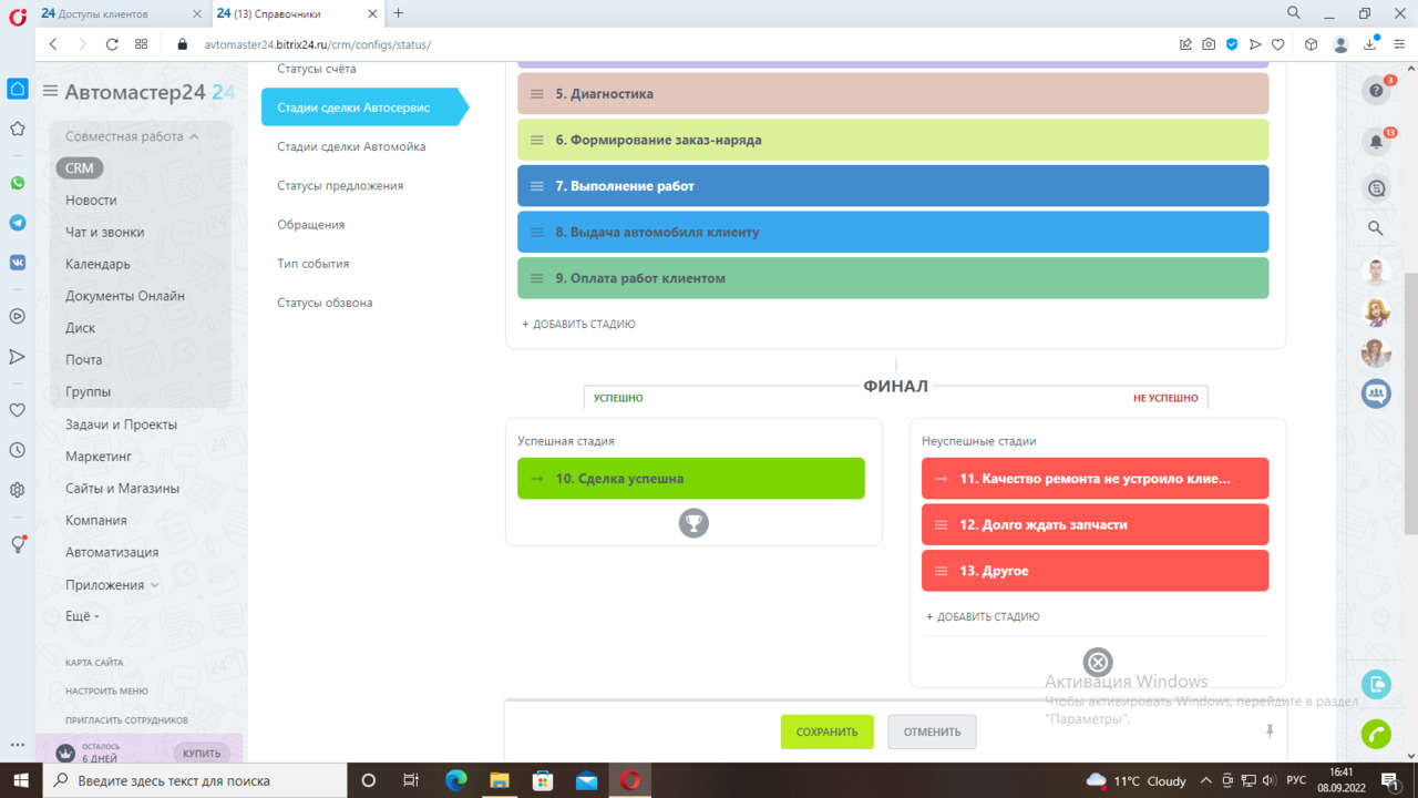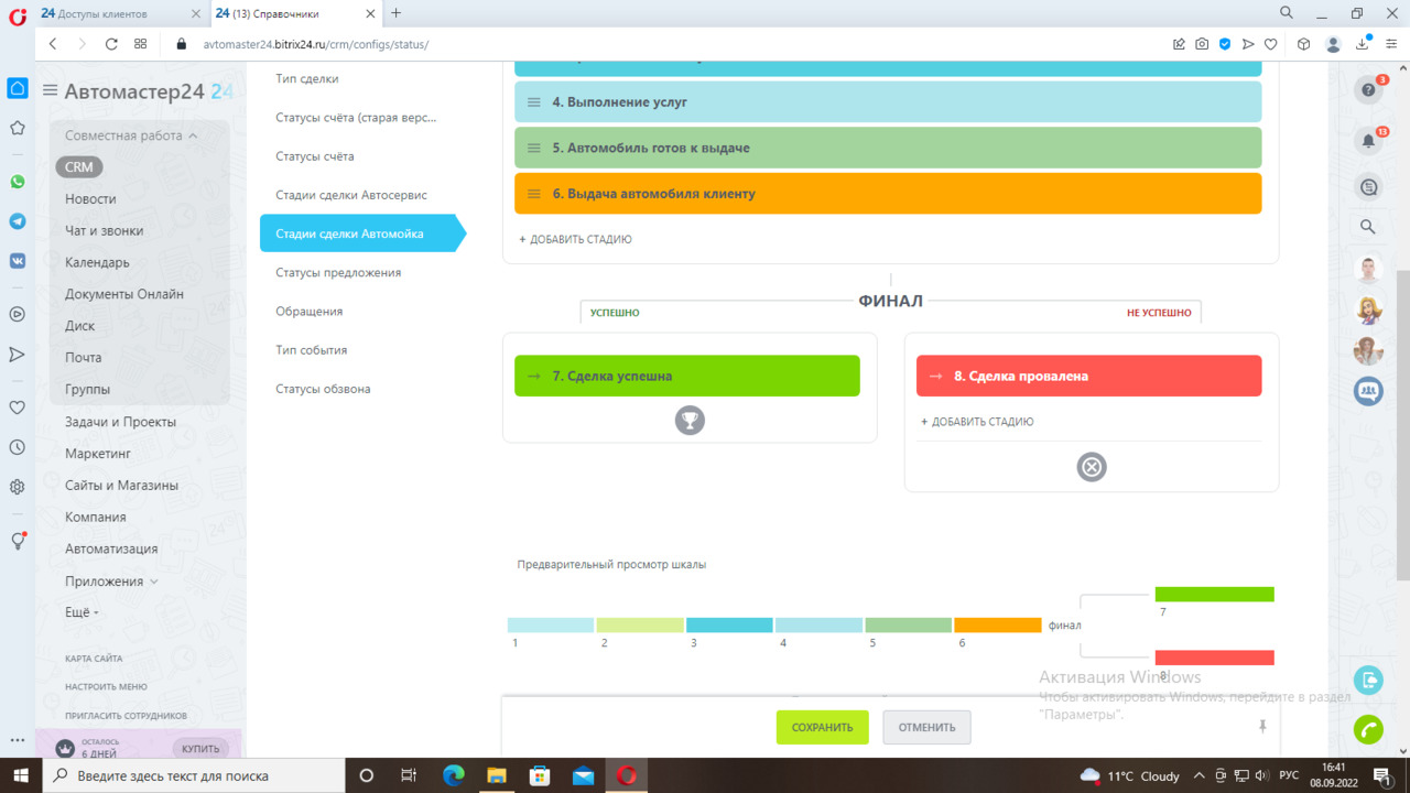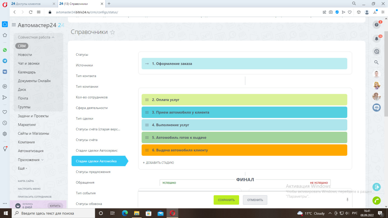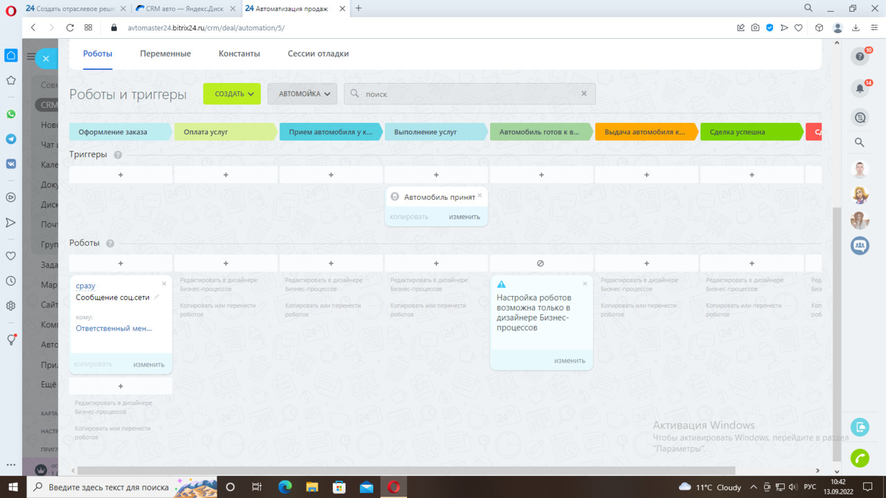 Первая стадия «Оформление заказа» - уведомление менеджеру о новой сделке по направлению Автомойка. Следующая стадия «Оплата услуг». Далее «Прием автомобиля у клиента». После приемки менеджеру необходимо поставить отметку о приемке автомобиля в карточке сделки. Срабатывает триггер и переводит карточку на следующую стадию «Выполнение услуг». Далее после завершения этой стадии идет стадия «Автомобиль готов к выдаче», приходит уведомление менеджеру. Менеджер переводит карточку в следующую стадию «Выдача автомобиля клиенту». Далее стадии «Сделка успешна» или «Сделка провалена».