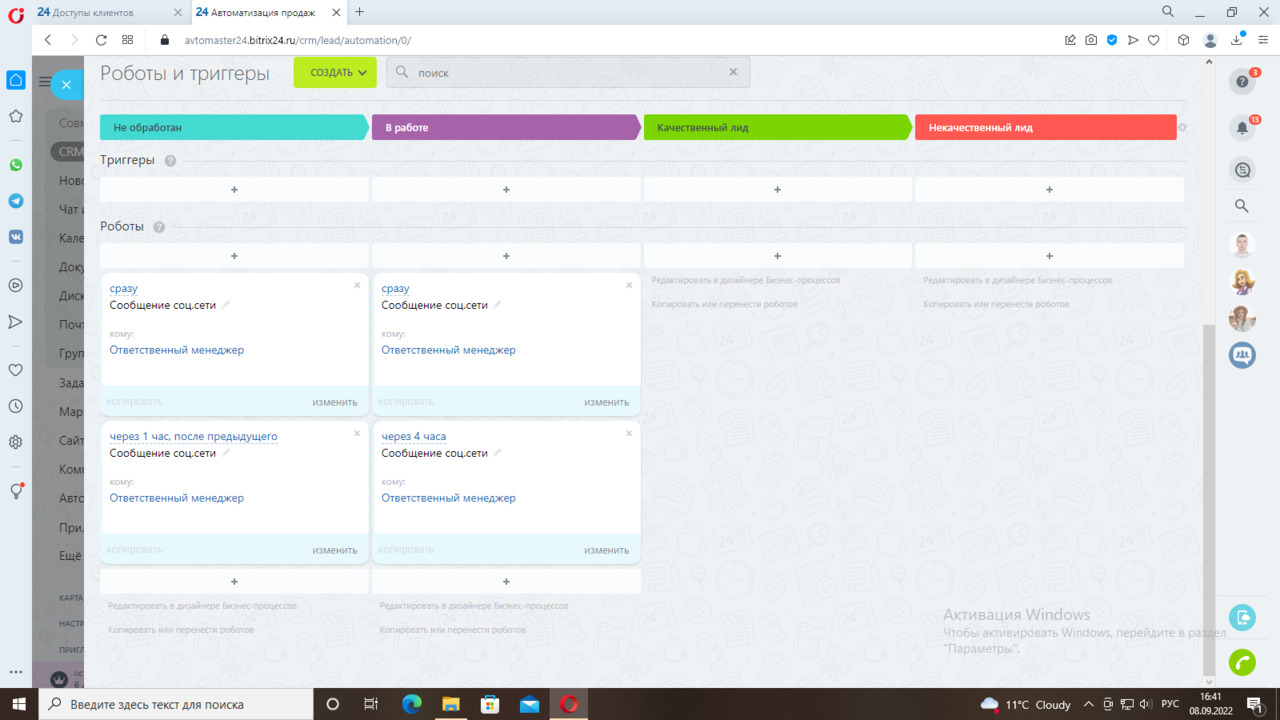 В лидах настроены стадии: не обработан, в работе, качественный лид и некачественный лид. На стадии «Не обработан» ответственному менеджеру приходит уведомление о необходимости взять лид в работу. При бездействии менеджера через час ему придет напоминание. На стадии «В работе» робот напоминает менеджеру о необходимости связаться с клиентом и конвертации лида в сделку.