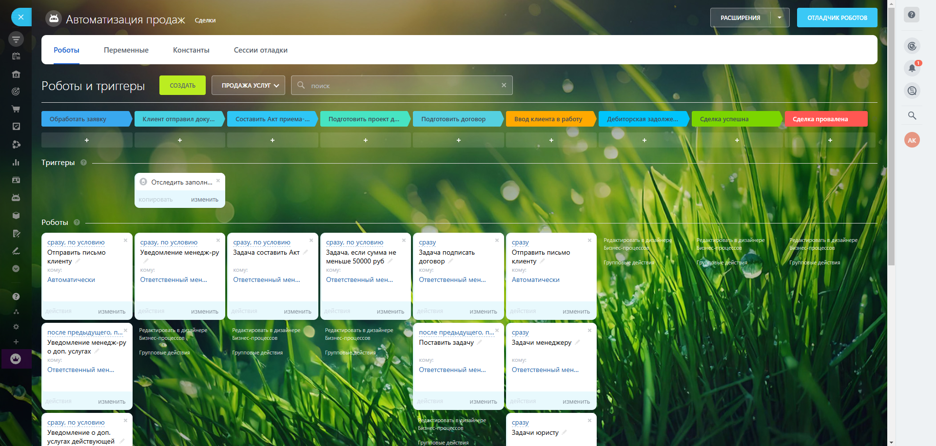 | Для удобства воронка автоматизирована роботами и триггерами: уведомления менеджеру, постановка задач и триггер на форму, которую заполняет клиент. |