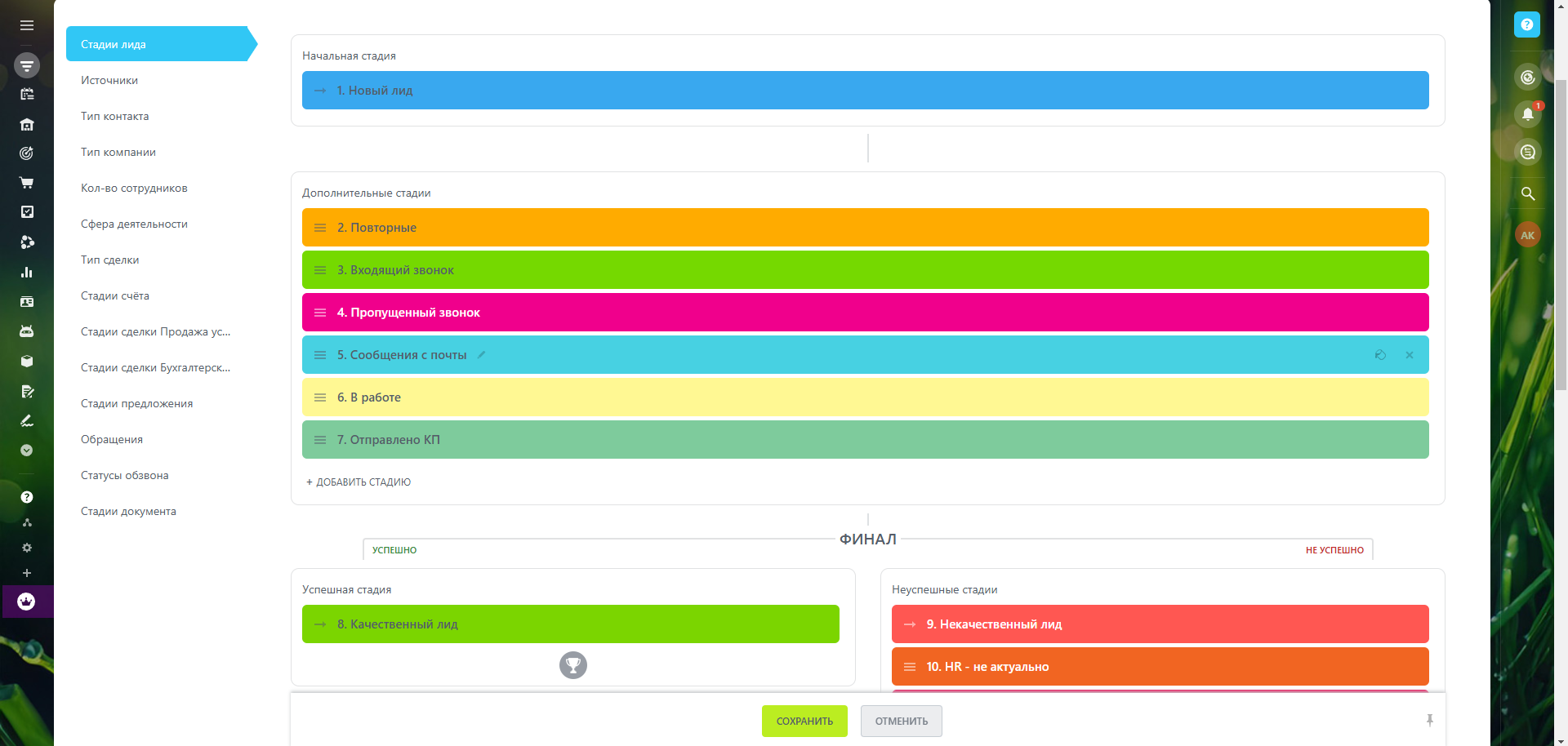 Сообщения с почты – в этот статус попадают лиды, которые создаются из почтовых сообщений. Для удобства выделили под это отдельную стадию.