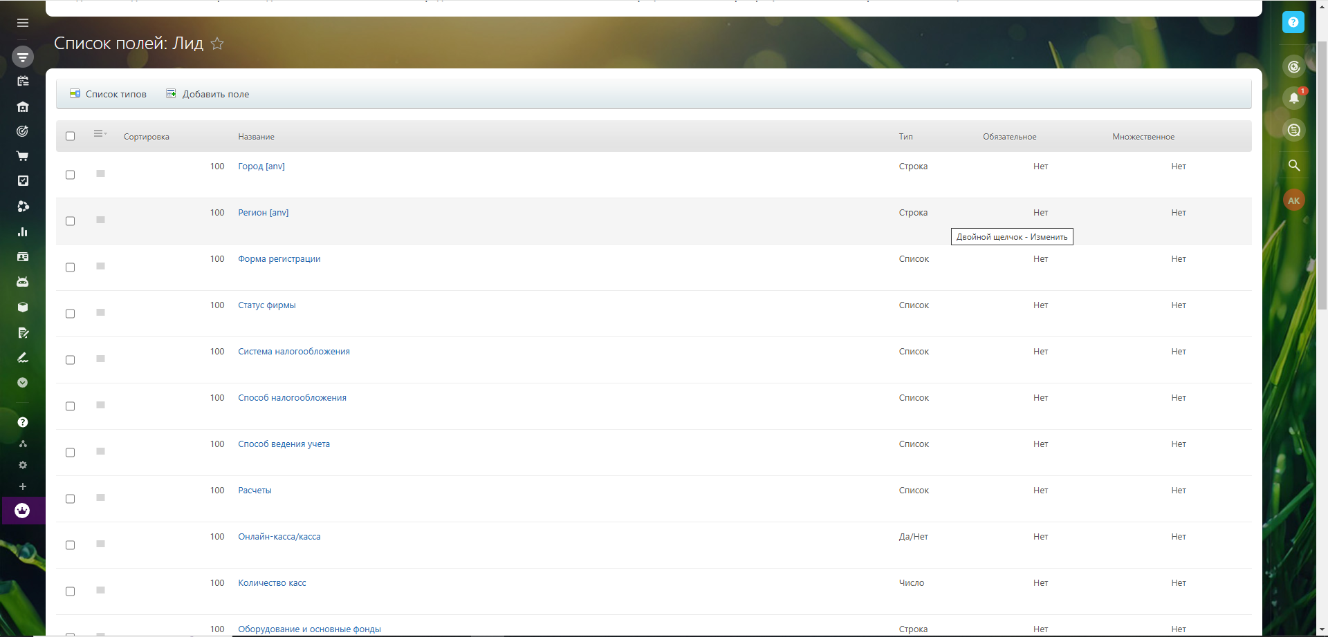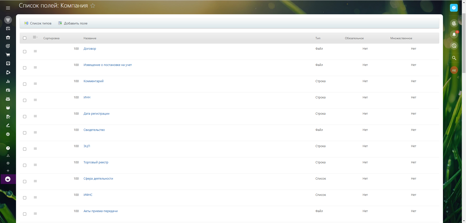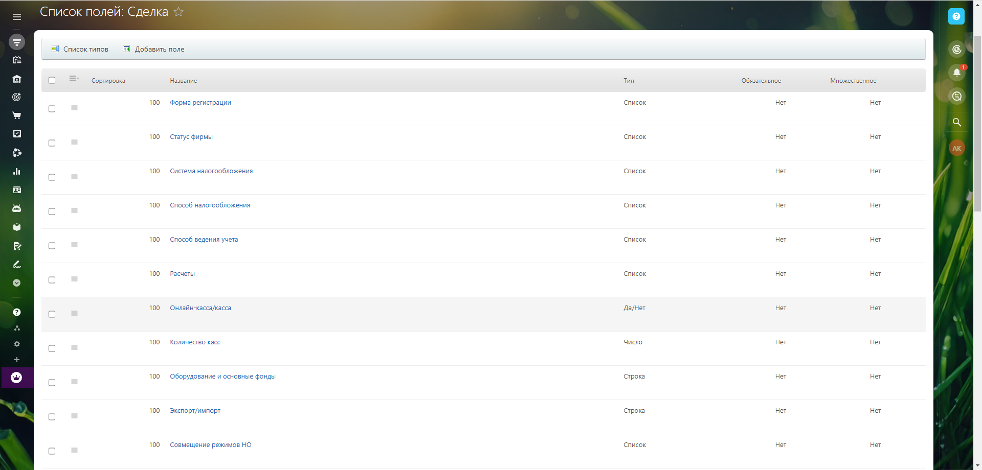 В лиде и в сделке: Форма регистрации, Статус фирмы, Система налогообложения, Способ налогообложения, Способ ведения учета, Расчеты, Онлайн-касса/касса, Количество касс, Оборудование и основные фонды, Экспорт/импорт, Совмещение режимов, НО, Нужен доступ к программе учета 1С, Есть специалист, который выписывает на месте накладные акты по реализации, Банк ЭЦП, Устав , Свидетельство о гос. регистрации, Извещение о постановке на учет, Извещение о постановке на учет в ФНС, Документы отправили, Прочее