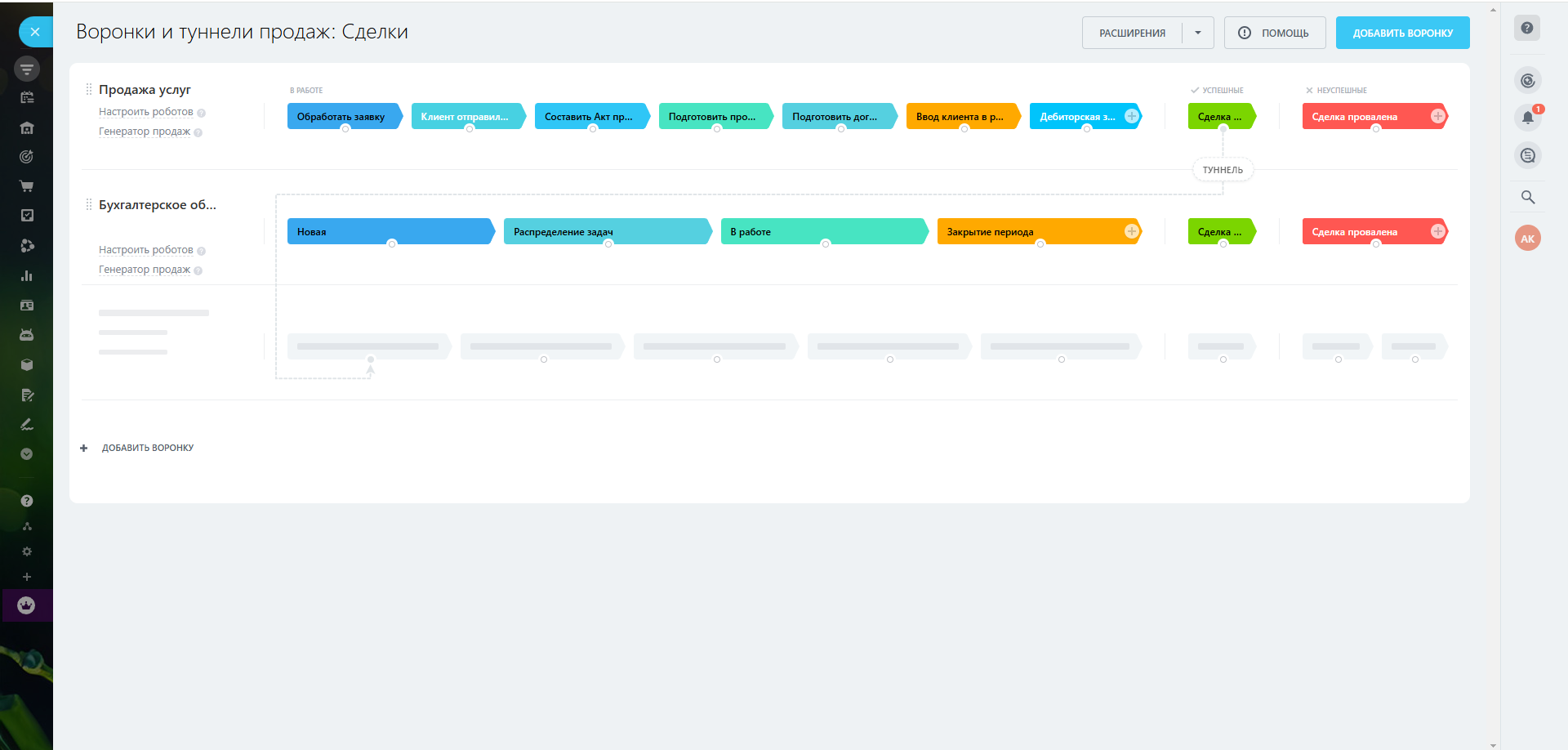 Помимо лидов мы настроили два направления сделок: «Продажа услуг», «Бухгалтерское обслуживание». Направление «Продажа услуг» является основным, ту происходит первая продажа. Направление «Бухгалтерское обслуживание» для регулярного обслуживания сделок по клиентам.Направление «Продажа услуг»