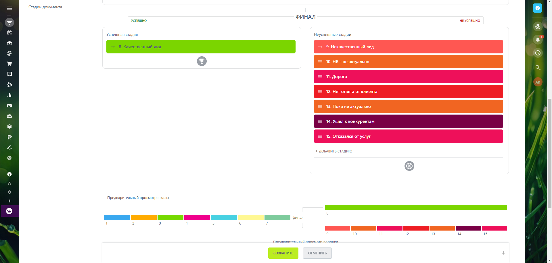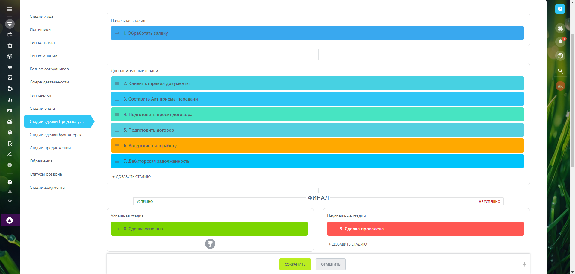 а также закрывающие стадии "Сделка успешна" и "Сделка провалена"