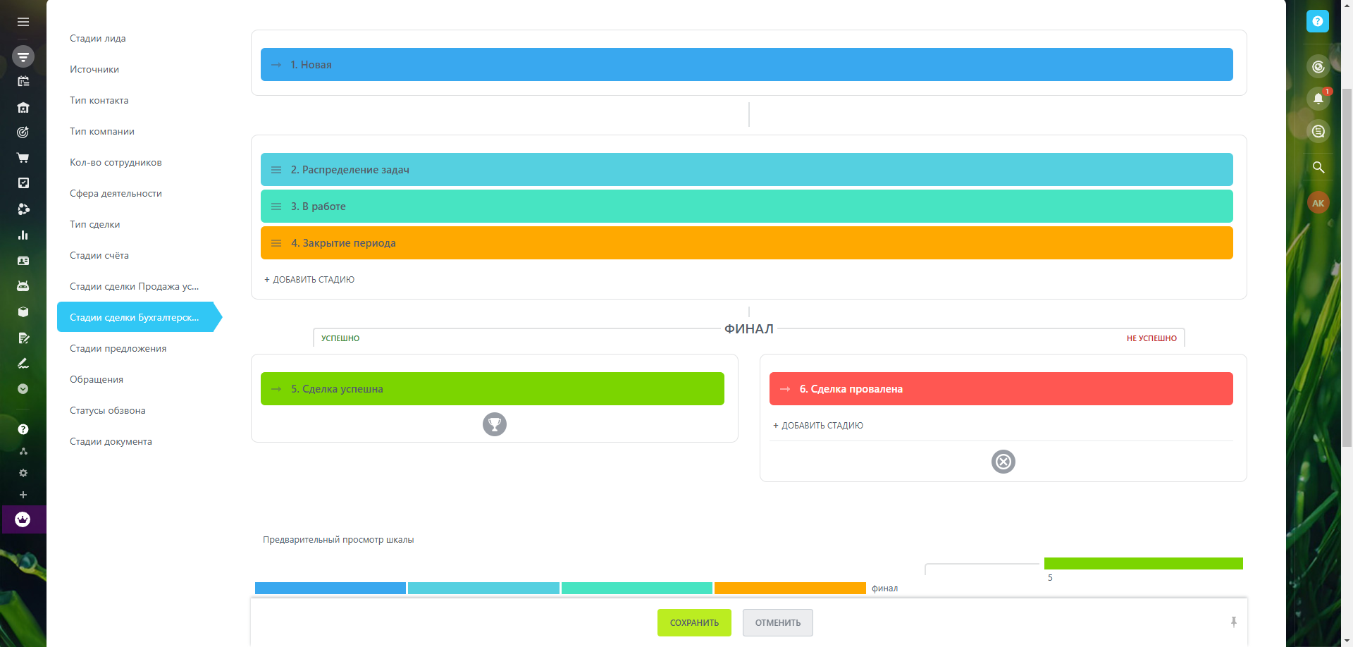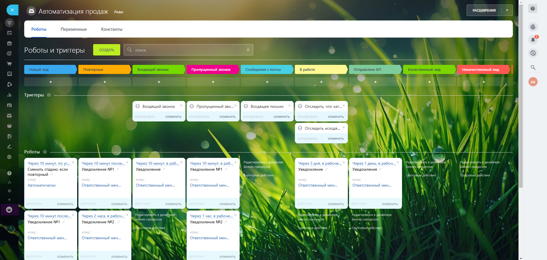 Мы настроили воронку лидов, так как многие компании по бухгалтерскому сопровождению работают с лидами. Прописали следующие статусы: «Новый лид», «Повторные», «Входящий звонок», «Пропущенный звонок», «Сообщения с почты», «В работе», «Отправлено КП» и закрывающие статусы «Качественный лид», «Некачественный лид», «HR - не актуально», «Дорого», «Нет ответа от клиента», «Пока не актуально», «Ушел к конкурентам», «Отказался от услуг». Дополнительно мы написали роботов, которые будут напоминать менеджерам про лиды и ставить задачи, а также помогать контролировать статусы руководителю.