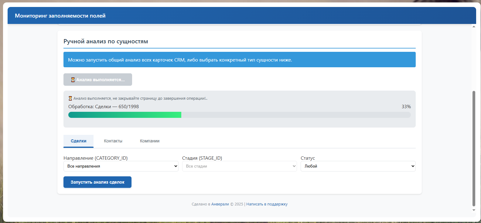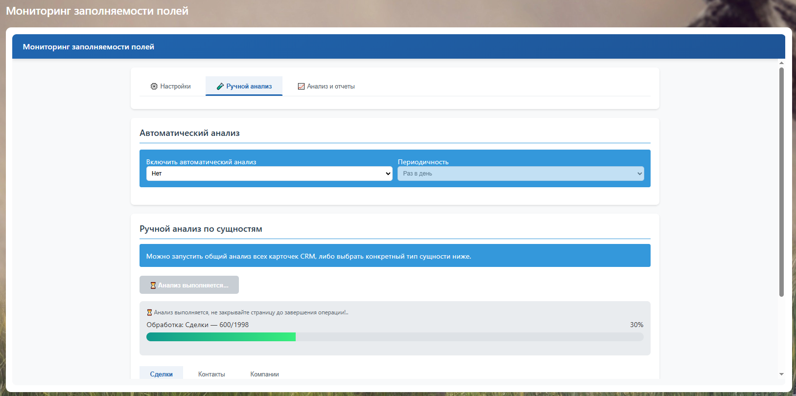 Автоматически считает “заполняемость” карточек Сделок/Контактов/Компаний по выбранным полям, записывает процент в отдельное поле и показывает наглядные отчёты (графики, ТОП‑10 лучших/худших). Есть ручной и автоматический анализ по расписанию.