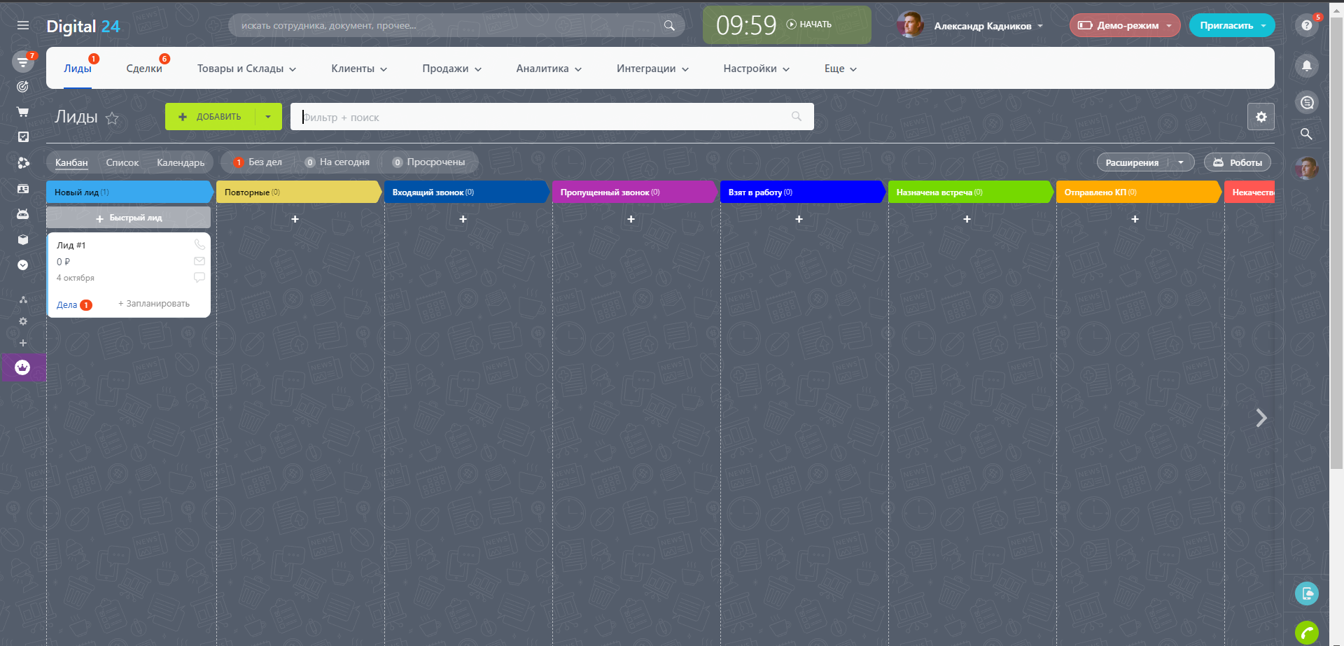 Мы настроили воронку лидов, так как многие диджитал агенства работают с лидами. Прописали следующие статусы: «Новый лид», «Повторные», «Входящий звонок», «Пропущенный звонок», «Взят в работу», «Назначена встреча», «Отправлено КП» и закрывающие статусы «Качественный лид», «Некачественный лид». Дополнительно мы написали роботов, которые будут ставить задачи и помогать контролировать статусы руководителю.
