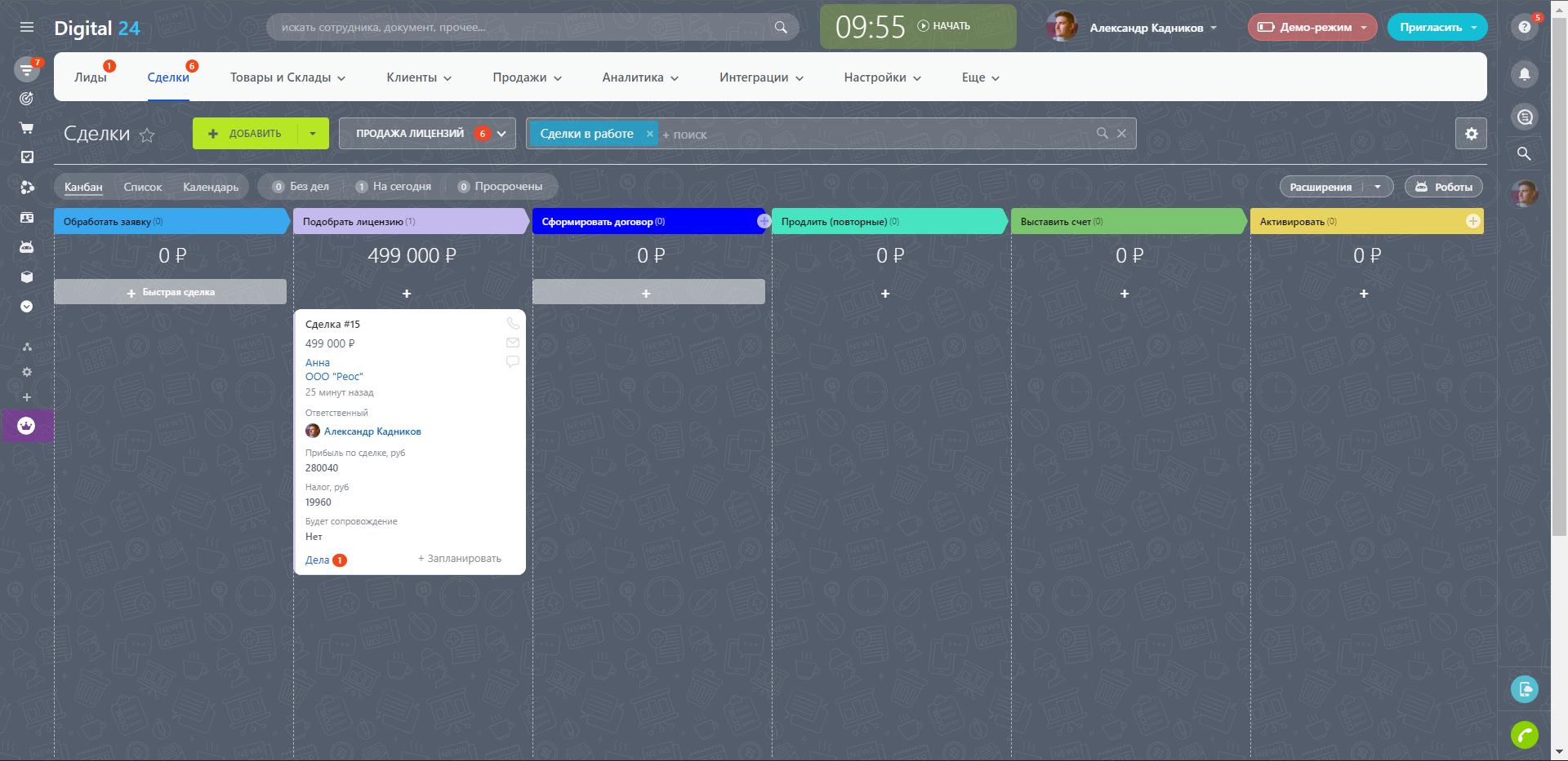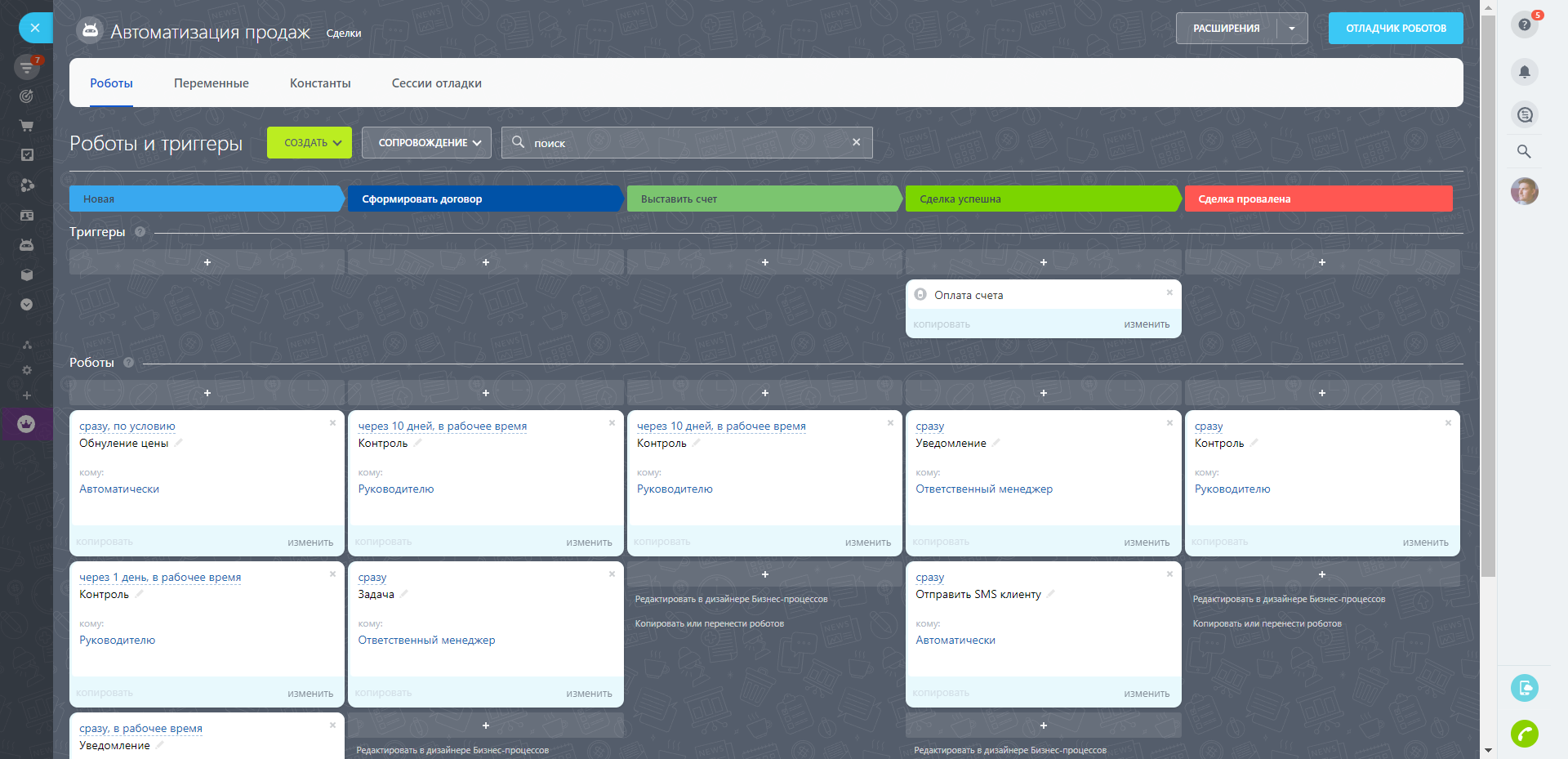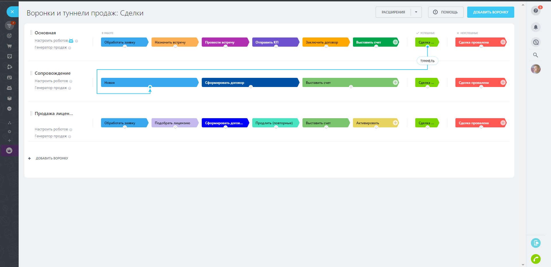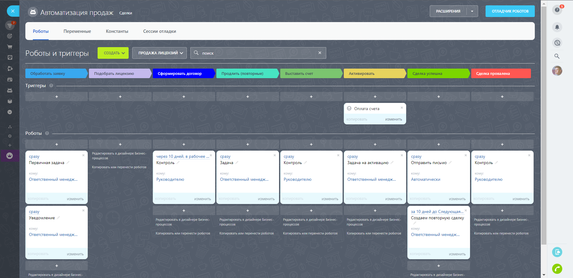 Помимо лидов мы настроили три направления сделок: «Основная», «Сопровождение», «Продажа лицензий». Стадии сделок во всех воронках в основном имею названия в виде призыва к действию. Сделано специально, чтобы воронка была своеобразной картой дальнейших действий и ориентира, что делать, для менеджера. На стадиях установлены роботы и триггеры для экономии времени менеджера от рутинных процессов.