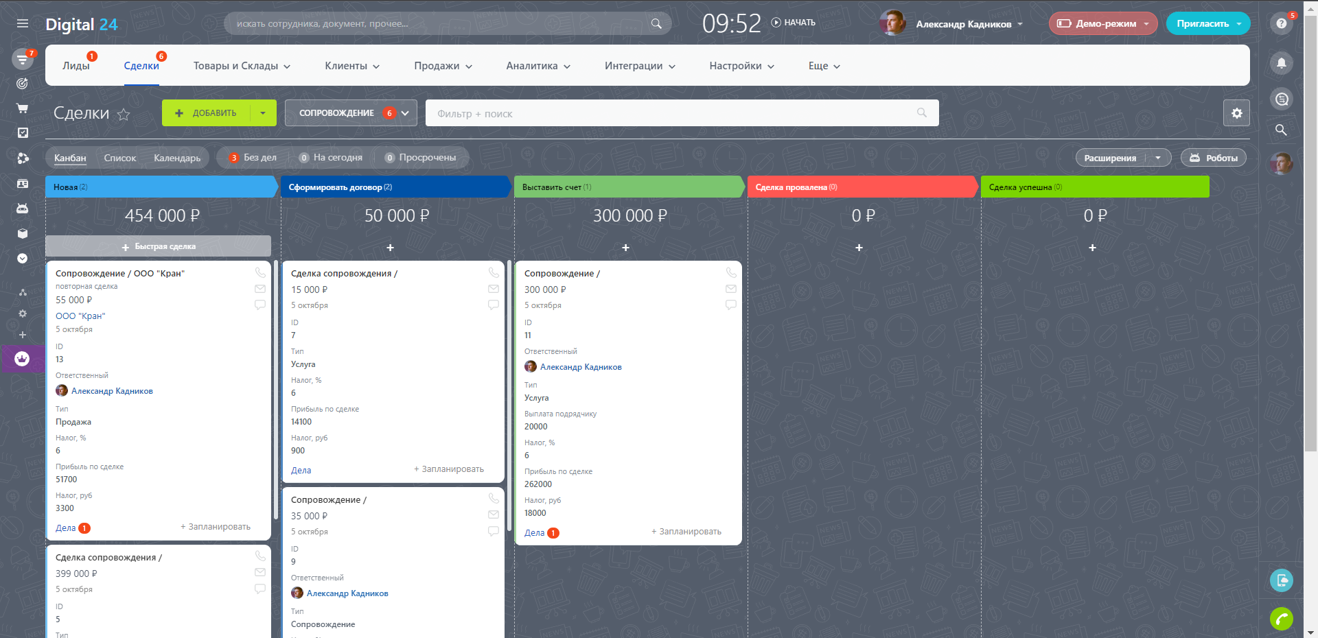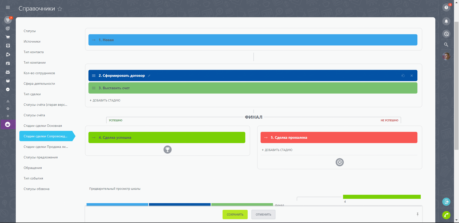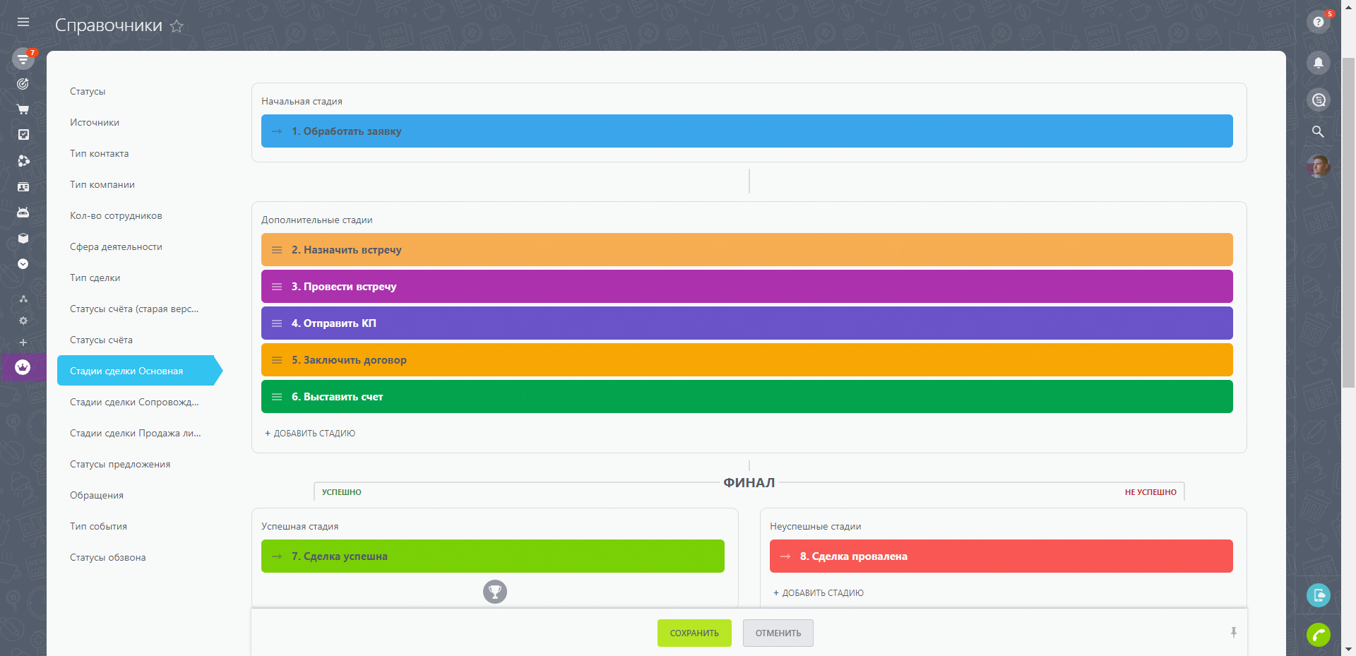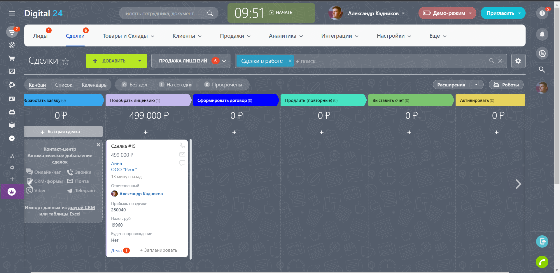 Помимо лидов мы настроили три направления сделок: «Основная», «Сопровождение», «Продажа лицензий». Стадии сделок во всех воронках в основном имею названия в виде призыва к действию. Сделано специально, чтобы воронка была своеобразной картой дальнейших действий и ориентира, что делать, для менеджера. На стадиях установлены роботы и триггеры для экономии времени менеджера от рутинных процессов.
