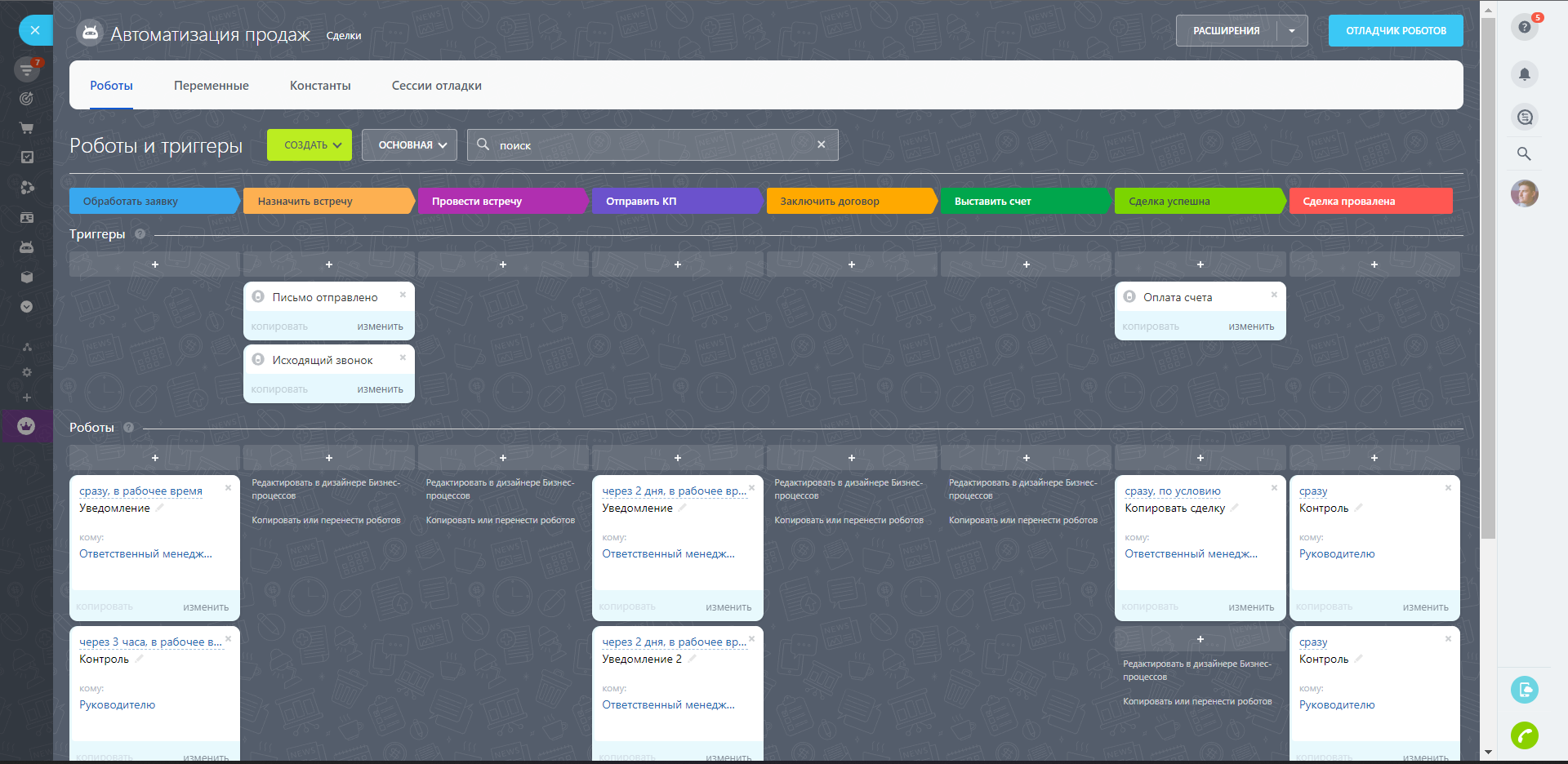 Обработать заявку – в эту стадию попадают сделки, сконвертированные из лида, а также прямы с сайта. На стадии установлены роботы уведомления и контроля.