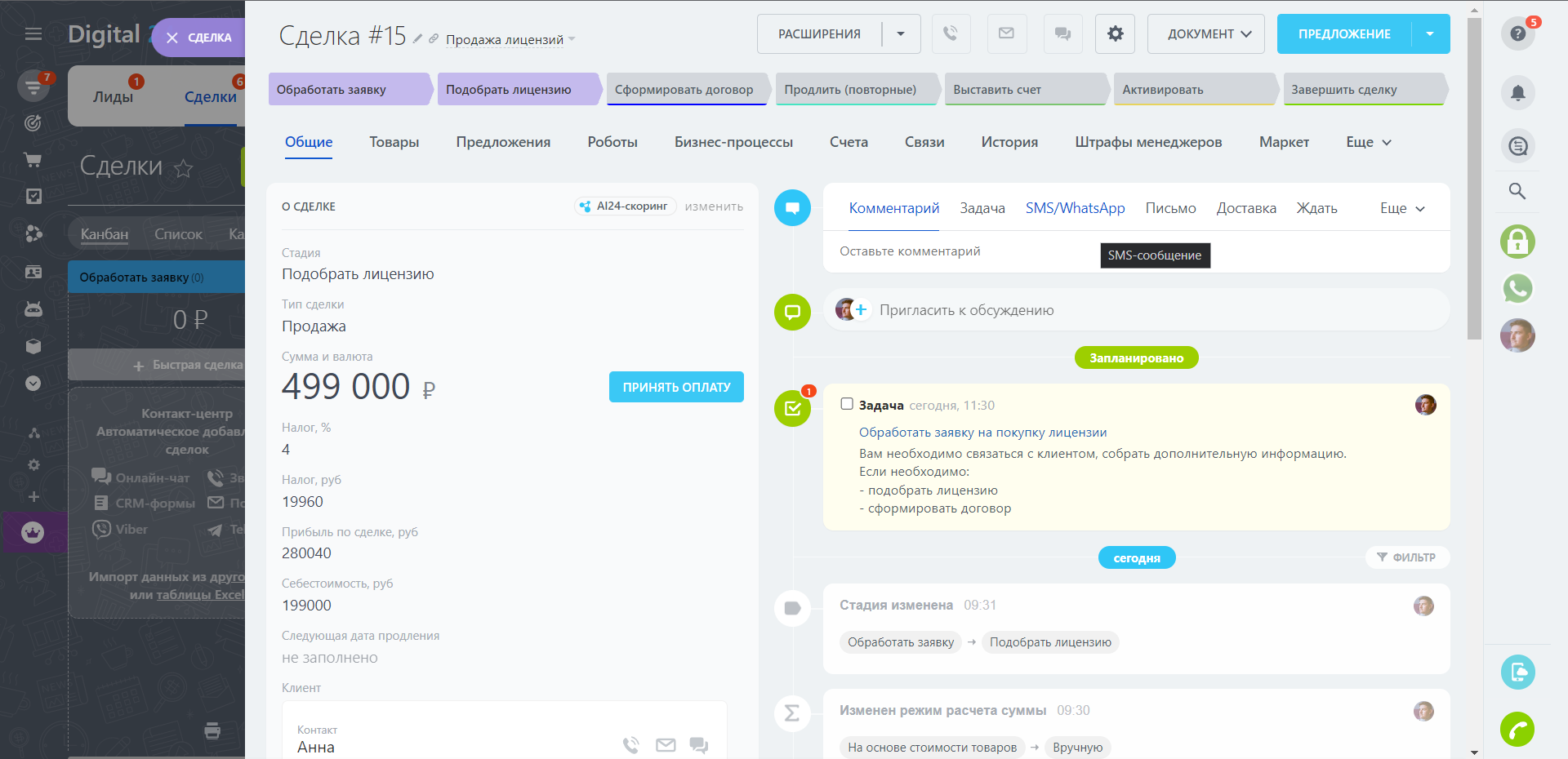 Подобрать лицензию – стадия для сделок, по которым идет подбор лицензии, подходящей клиенту