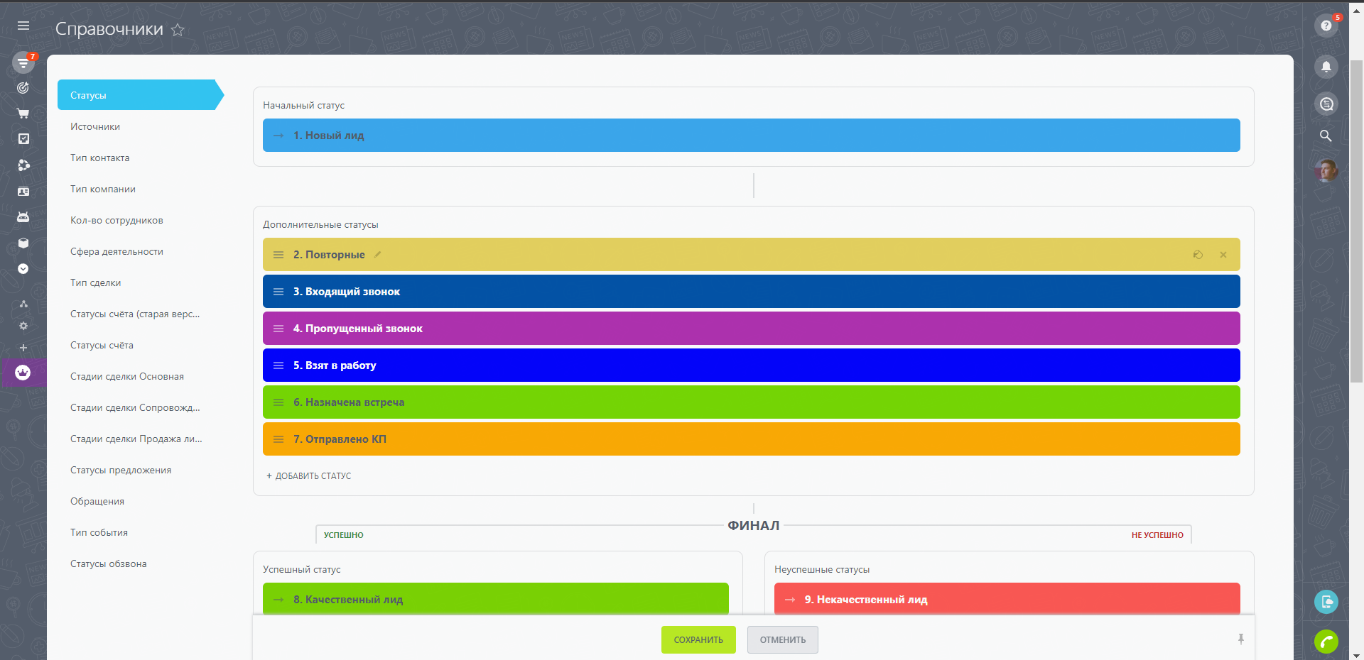 Повторные – в этот статус попадают повторные обращения от текущих клиентов. Выделил этот статус, как отдельный для удобства отображения и работы с воронкой.