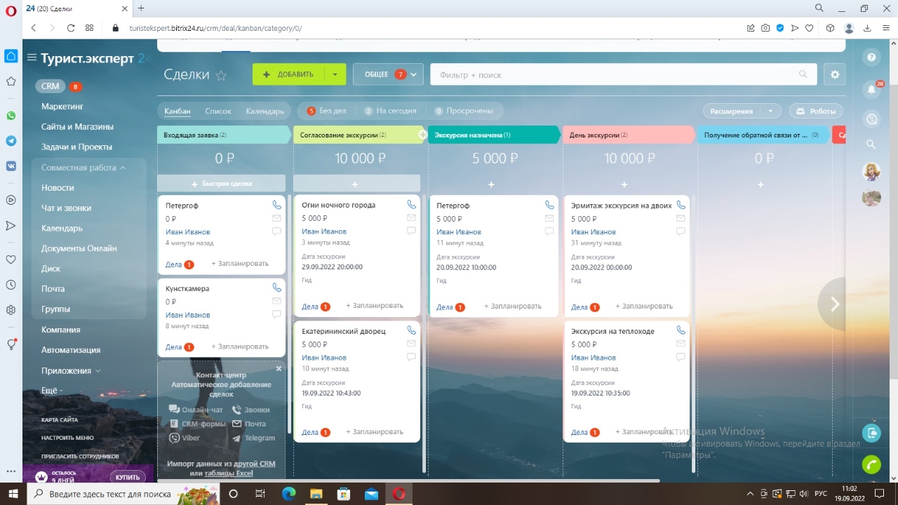 День экскурсии – на данной стадии находятся все сделки, которые запланированы на сегодня. Также приходит уведомление-напоминание ответственному гиду, о том, что у него запланирована экскурсия через 2 часа.
