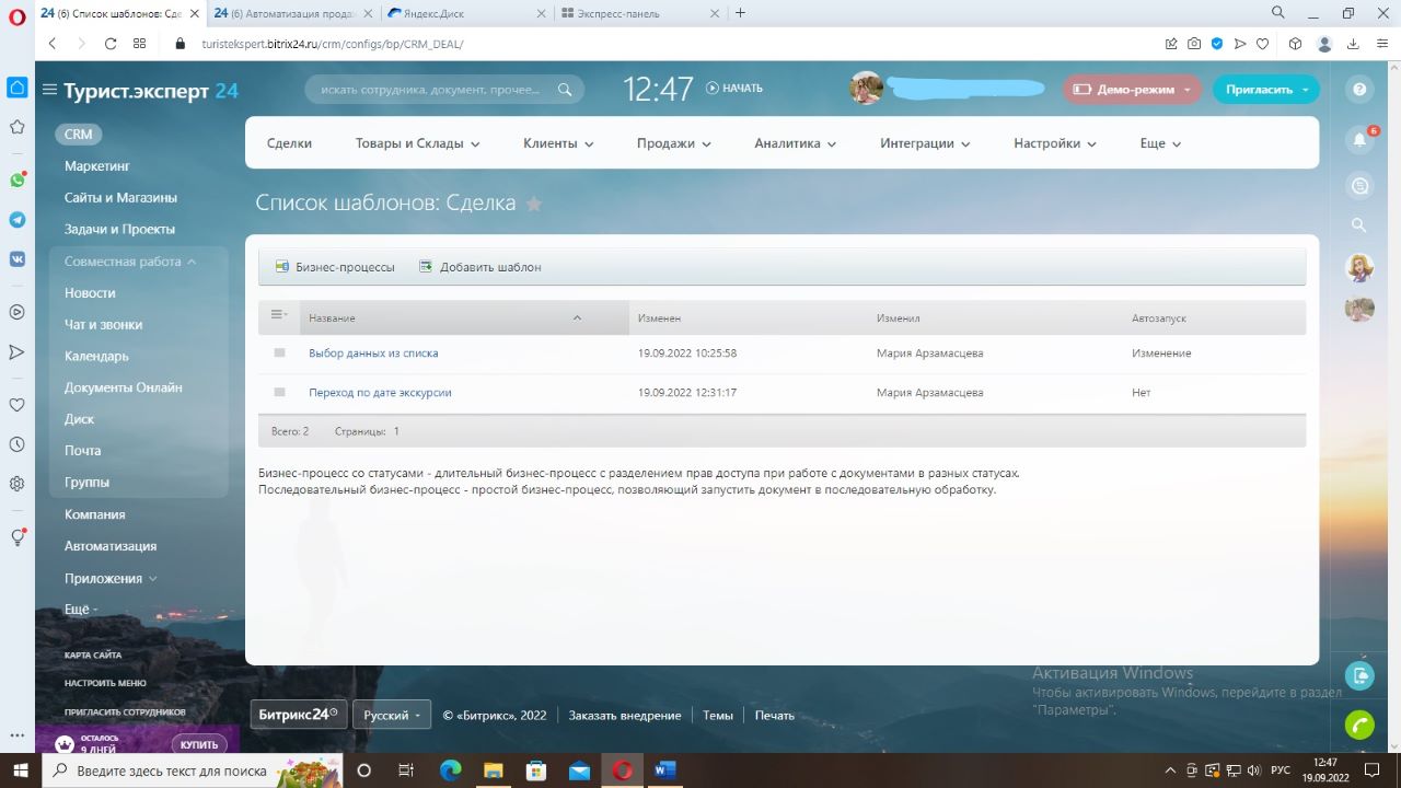 - написали 2 бизнес-процесса: для автоматического переноса карточки сделки на стадию «день экскурсии», считывая поле дата; и для заполнения полей по выбору нужной экскурсии.