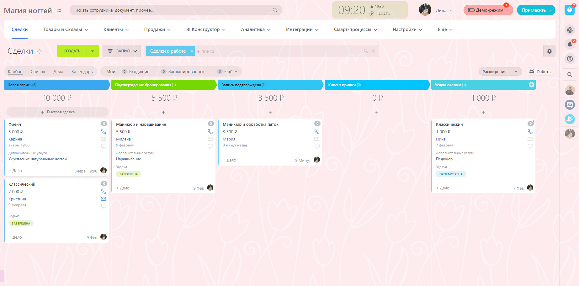 Готовое решение подойдет для мастера маникюра. С нашим решением вы сможете быстро запустить работу в CRM, начать отслеживать и фиксировать все обращения клиентов и сэкономить на услугах внедрения. Мы уже настроили этапы, карточки сделок и контактов для того, чтобы вам было проще разобраться в системе. А роботы в CRM будут вам подсказывать, что нужно сделать на этапах воронки.