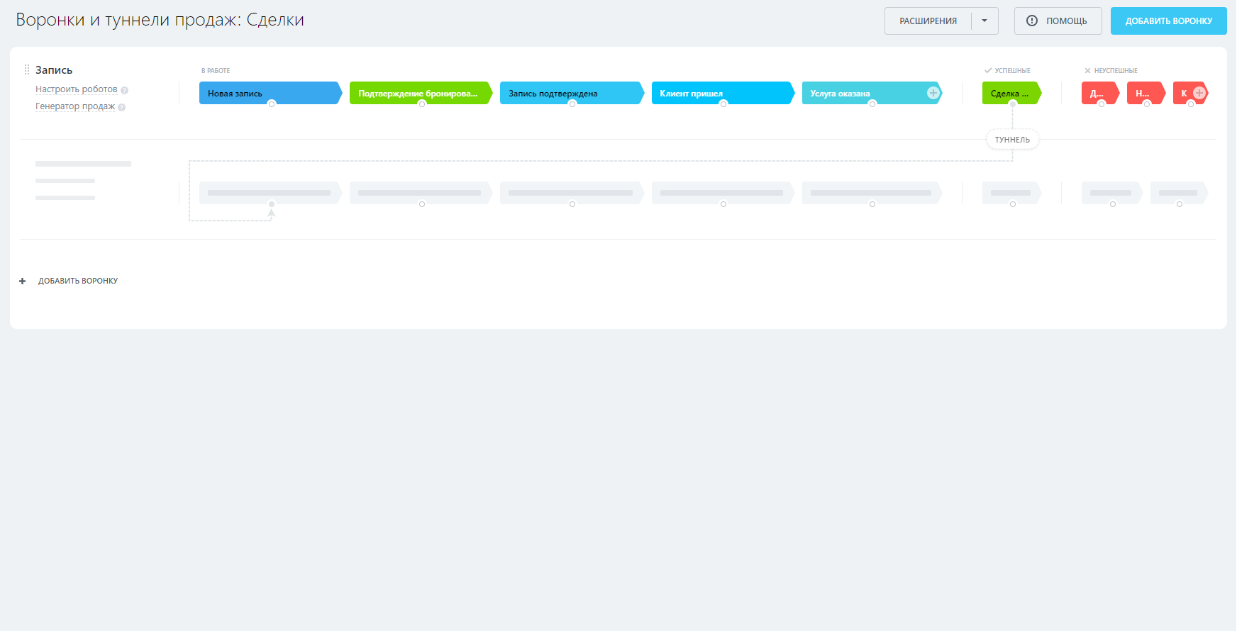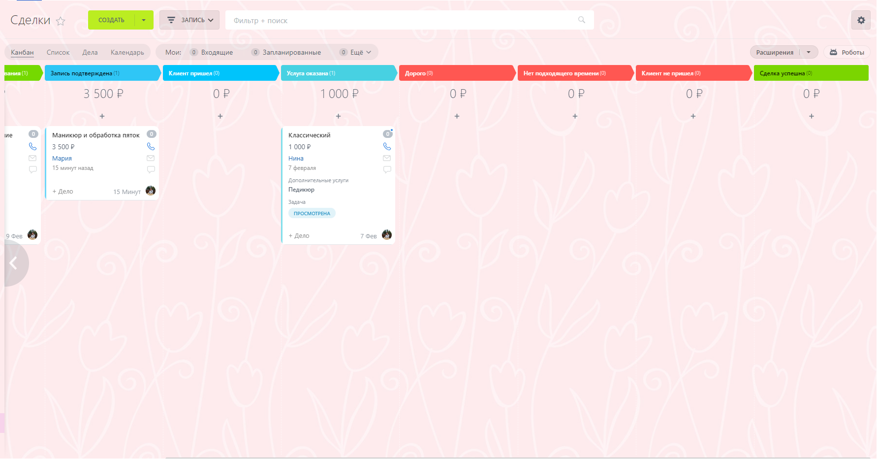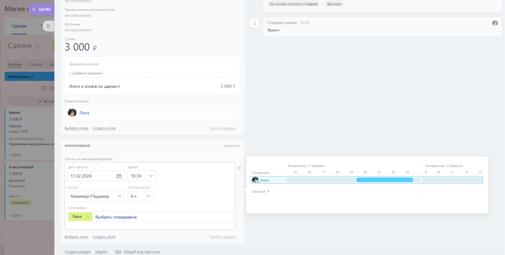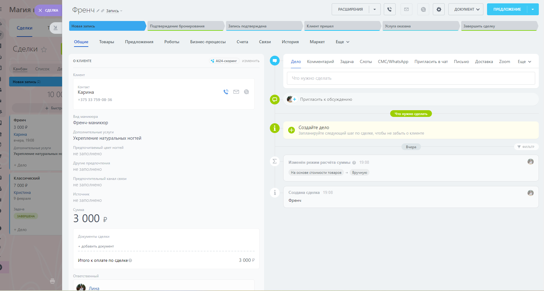 После того, как клиент подтвердил бронирование, менеджер переносит сделку на стадию «Запись подтверждена».