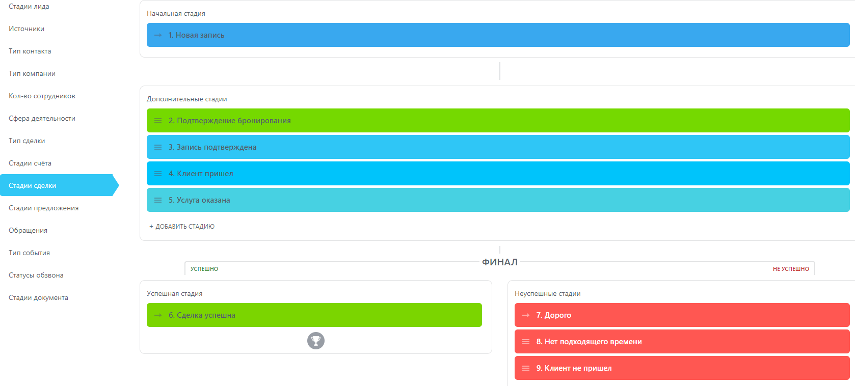 Первая стадия сделок «Новая запись» - универсальная стадия для воронки продаж, на которой менеджер создает сделку самостоятельно или получает автоматически, если подключены каналы коммуникаций. На данной стадии менеджер вносит информацию по записи клиента в карточку. Как только будут внесены данные по бронированию клиента (дата и время записи, название услуги и сотрудник), данная запись будет зафиксирована в календаре и уведомлять мастера о новой записи на услугу.