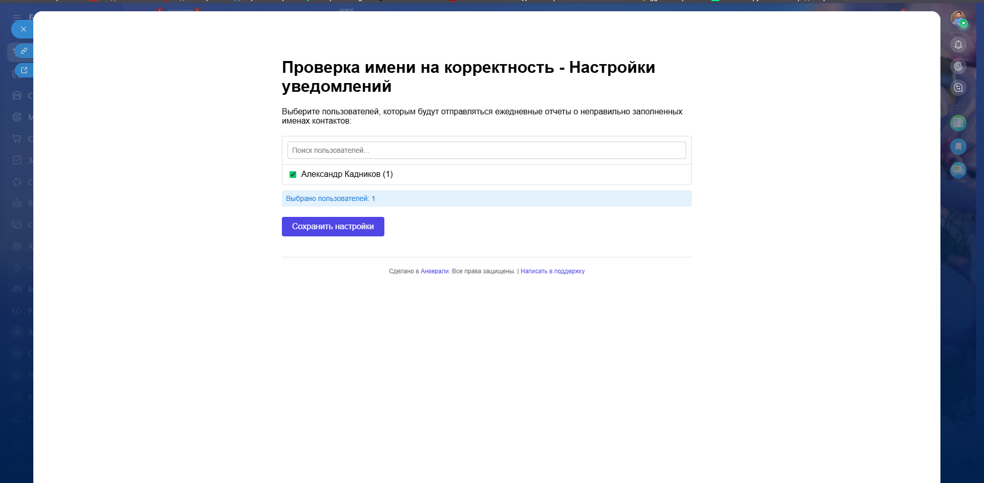 - Автоматическая проверка контактов — ежедневная проверка всех контактов в CRM на корректность заполнения имен