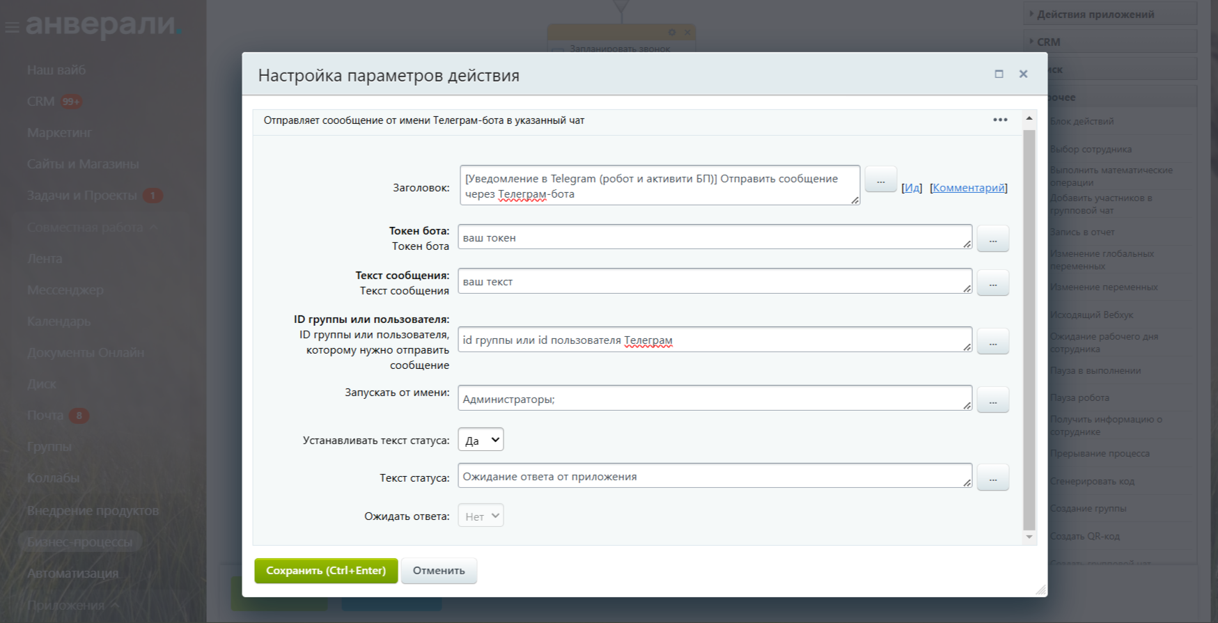 Приложение добавляет робота и активити в дизайнер бизнес-процессов, которое отправляет сообщения от имени Телеграм-бота в указанную группу или лично пользователю.