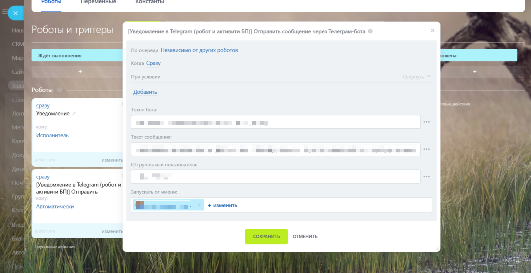 Сообщения можно отправлять по расписанию либо в зависимости от изменений на портале (например, когда лид или сделка попадает в стадию, где установлен робот приложения).