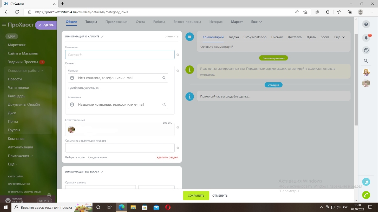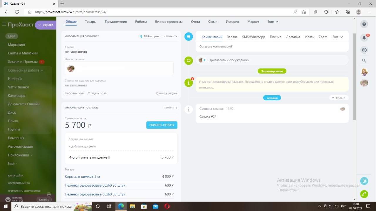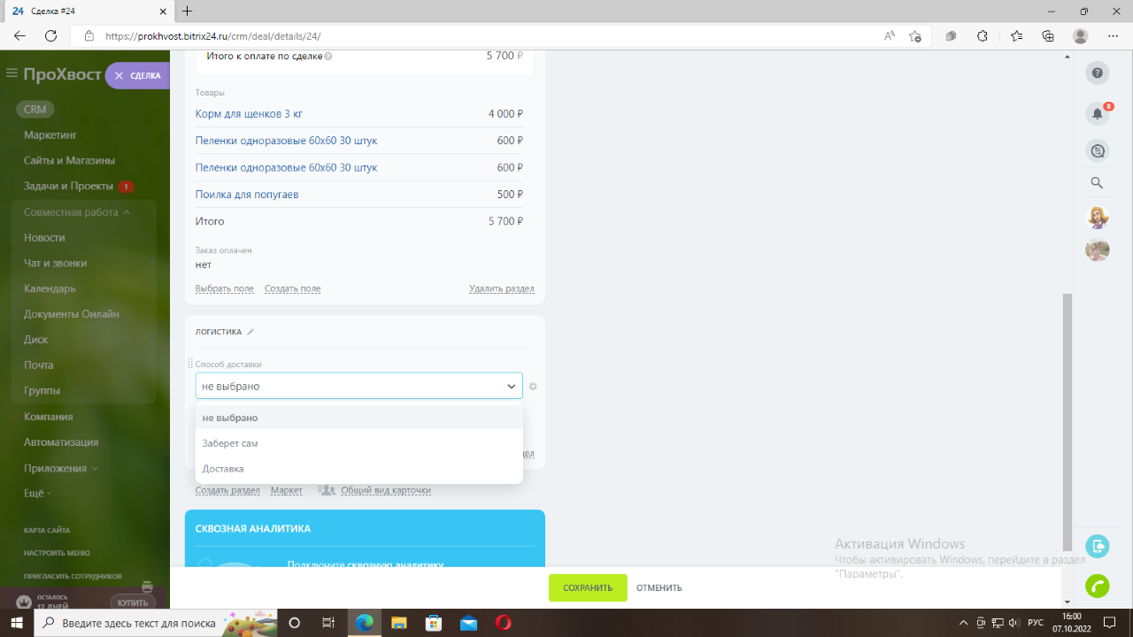 - Карточку сделки, добавили поля: способ доставки (список), адрес доставки, получена ли оплата от клиента;