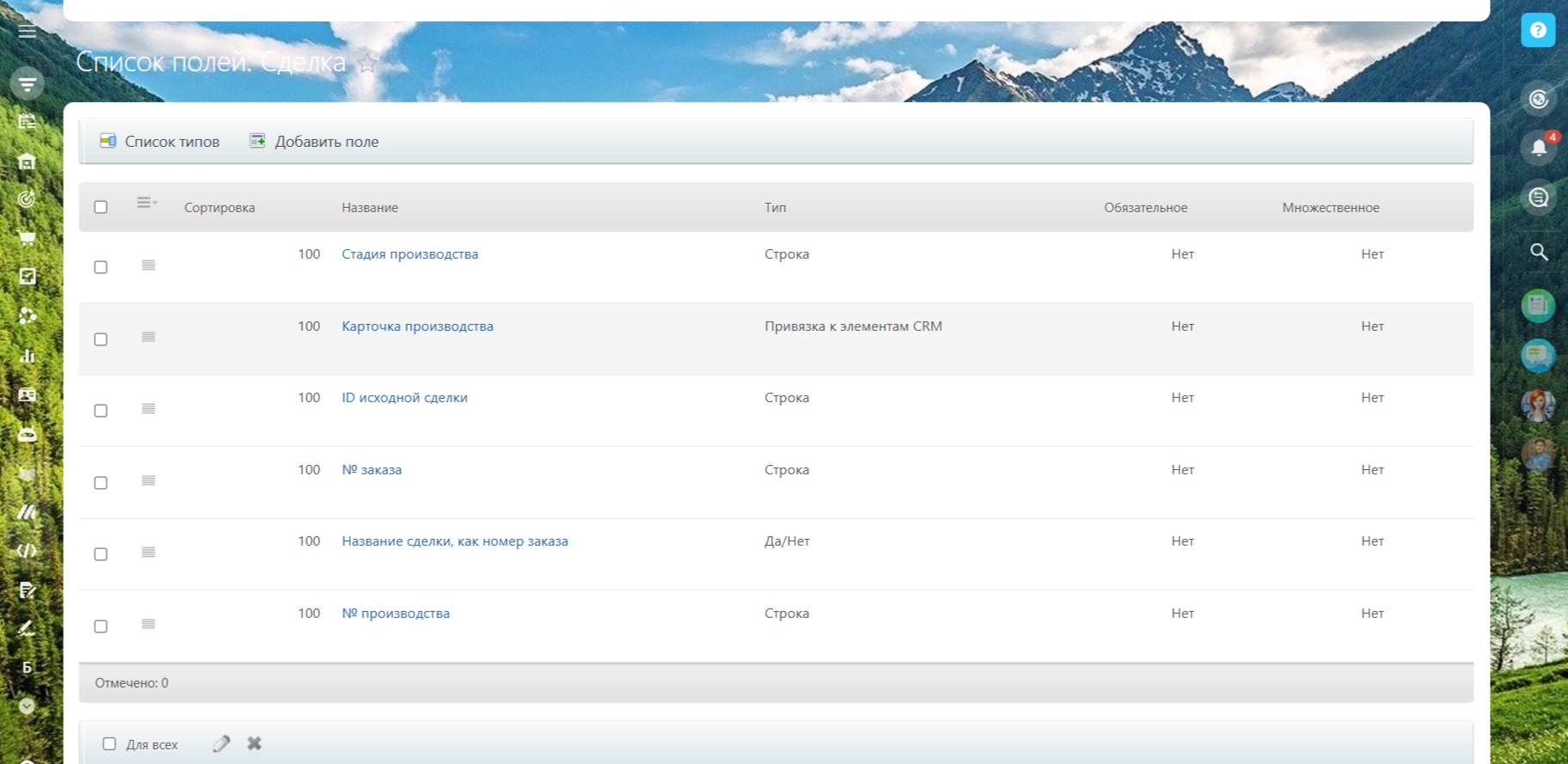 Какие поля созданы: Стадия производства, Карточка производства, ID исходной сделки, № заказа, Название сделки, как номер заказа, № производства