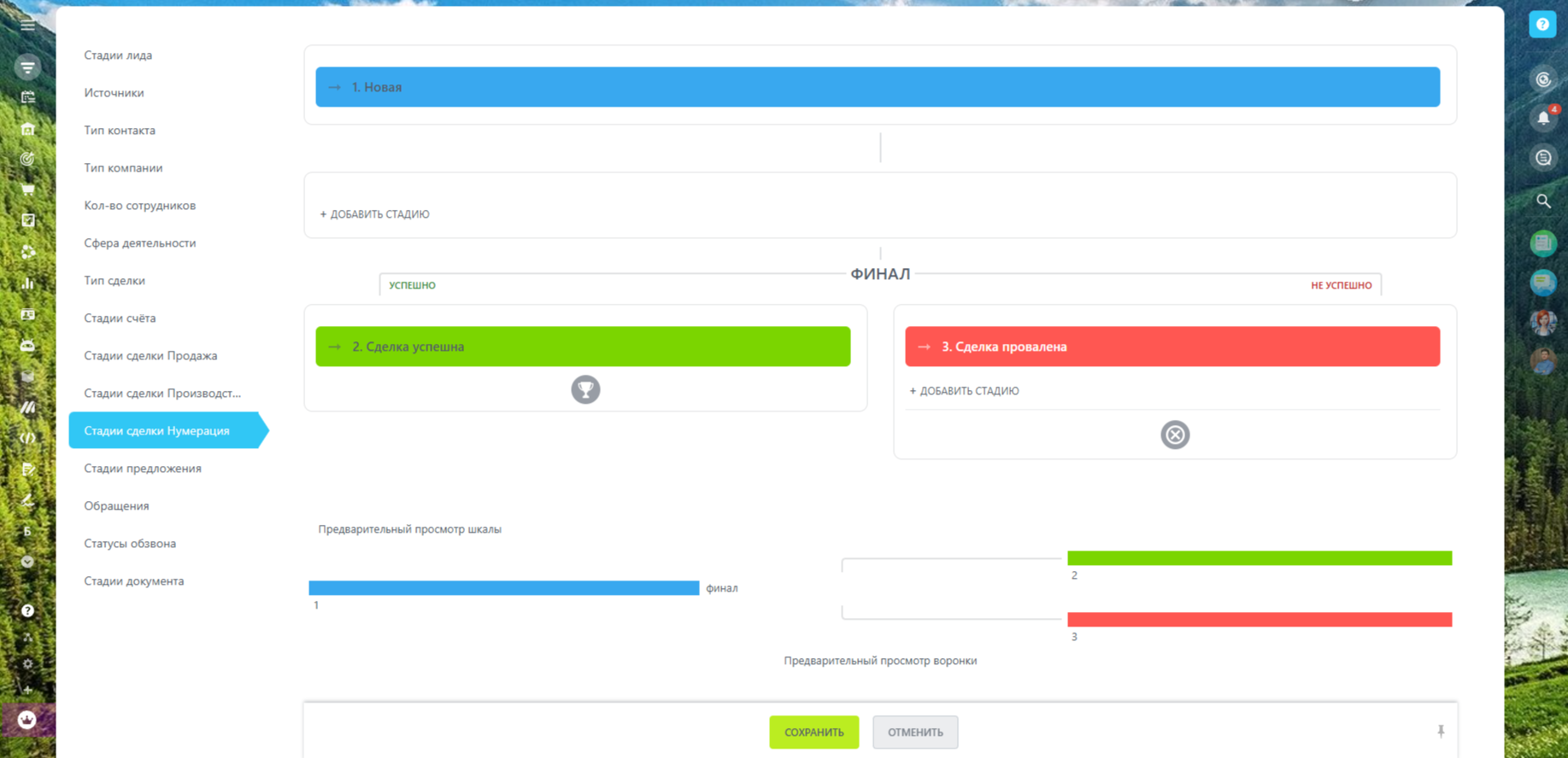 А также стандартные закрывающие стадии: Сделка успешна, Сделка провалена и Анализ причины провала.