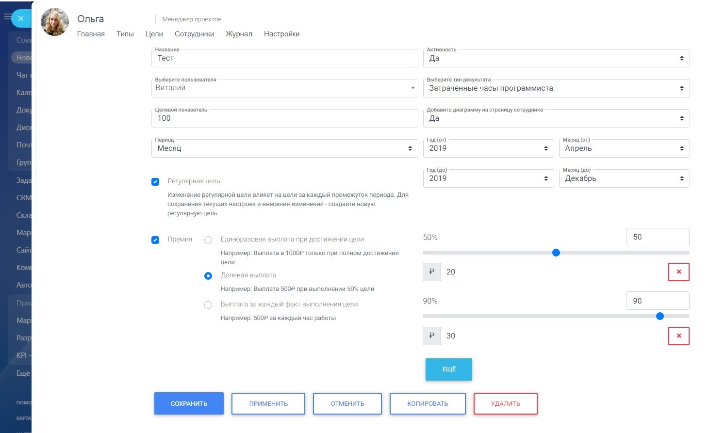 Используйте комплексный подход к созданию целейСтавьте цели подчиненным на основе созданных типов результата. Устанавливайте плановый показатель — тот результат, к которому должен стремиться исполнитель. Цель может быть разовой или долгосрочной. Быстрое создание целей через копирование упрощает вашу работу и сокращает временные затраты.