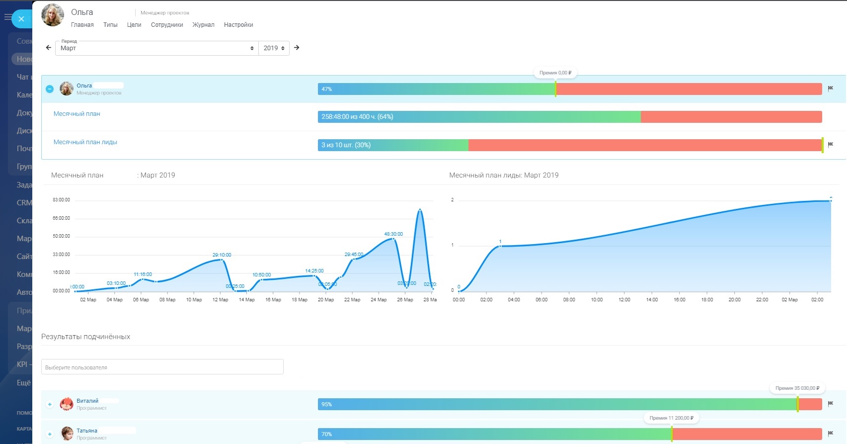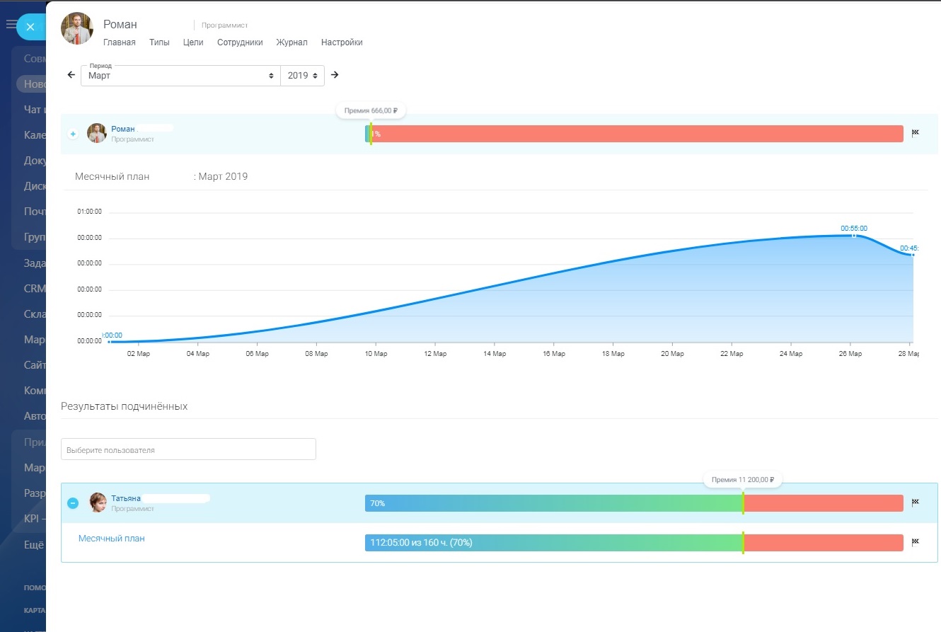 Изучайте детальную статистику по целевым показателям за отдельные периоды. Статистика по всем целям и текущий результат работы сотрудника отображается в виде интерактивной шкалы прогресса с премиальными отметками. Такие элементы геймификации мотивируют сотрудника и позволяют легче воспринимать и оценивать работу.