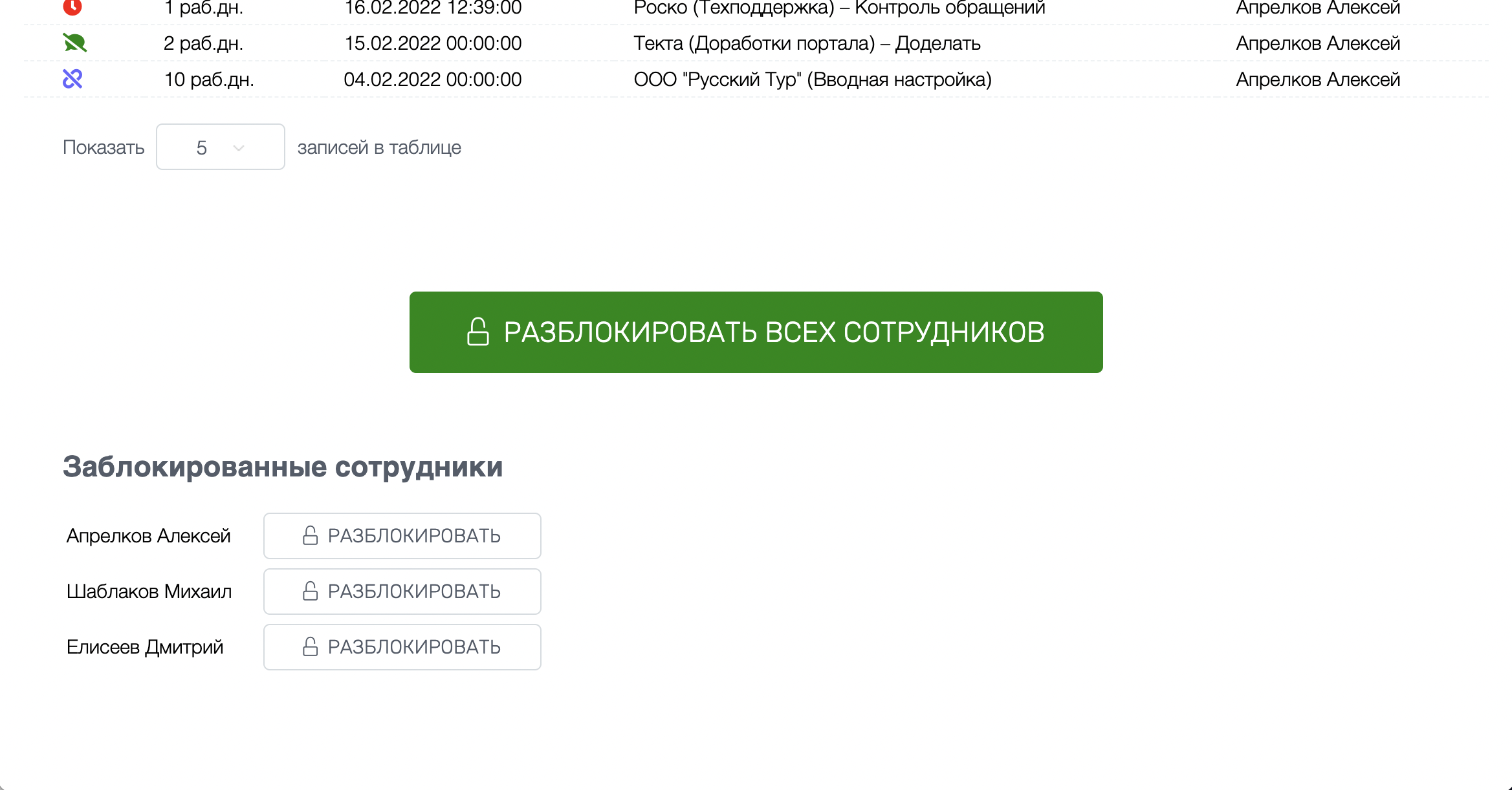 При этом в приложении есть возможность для Администратора в случае необходимости разблокировать отдельных Сотрудников или даже всех сразу одним нажатием кнопки.