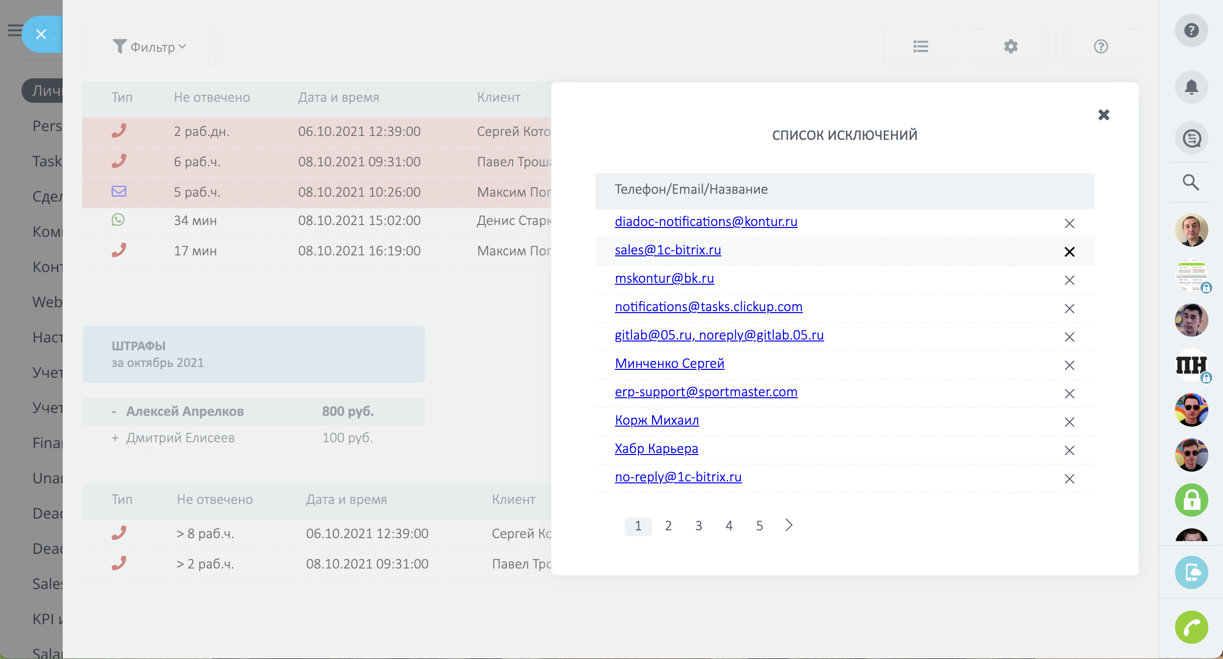 - Сотрудник может в списке неотвеченных звонков и писем предлагать внести определенные Контакты в исключения или не начислять за какие-то звонки и письма штраф, например из-за форс-мажорной ситуации. А Руководитель может утверждать или отклонять такие предложения.