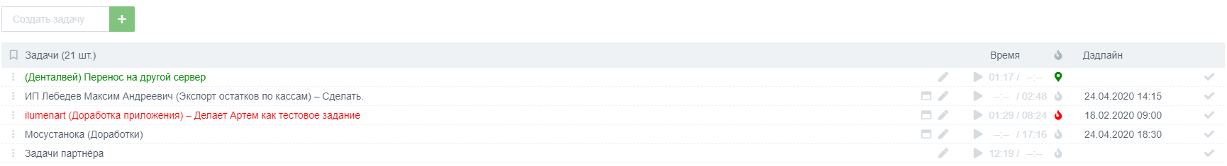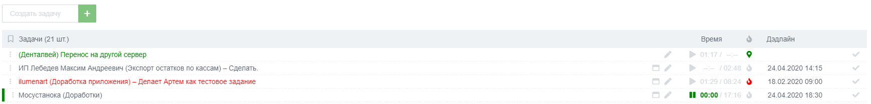 - В списке задач доступны также учет времени по задаче, отметка срочности задачи и быстрое завершение задачи.