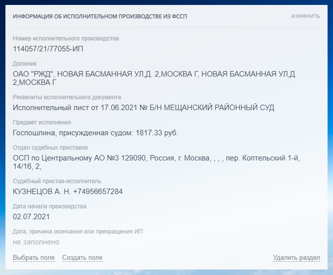 Заполните поле "Номер исполнительного производства" и получайте информацию о ходе производства прямо в поля сделки.