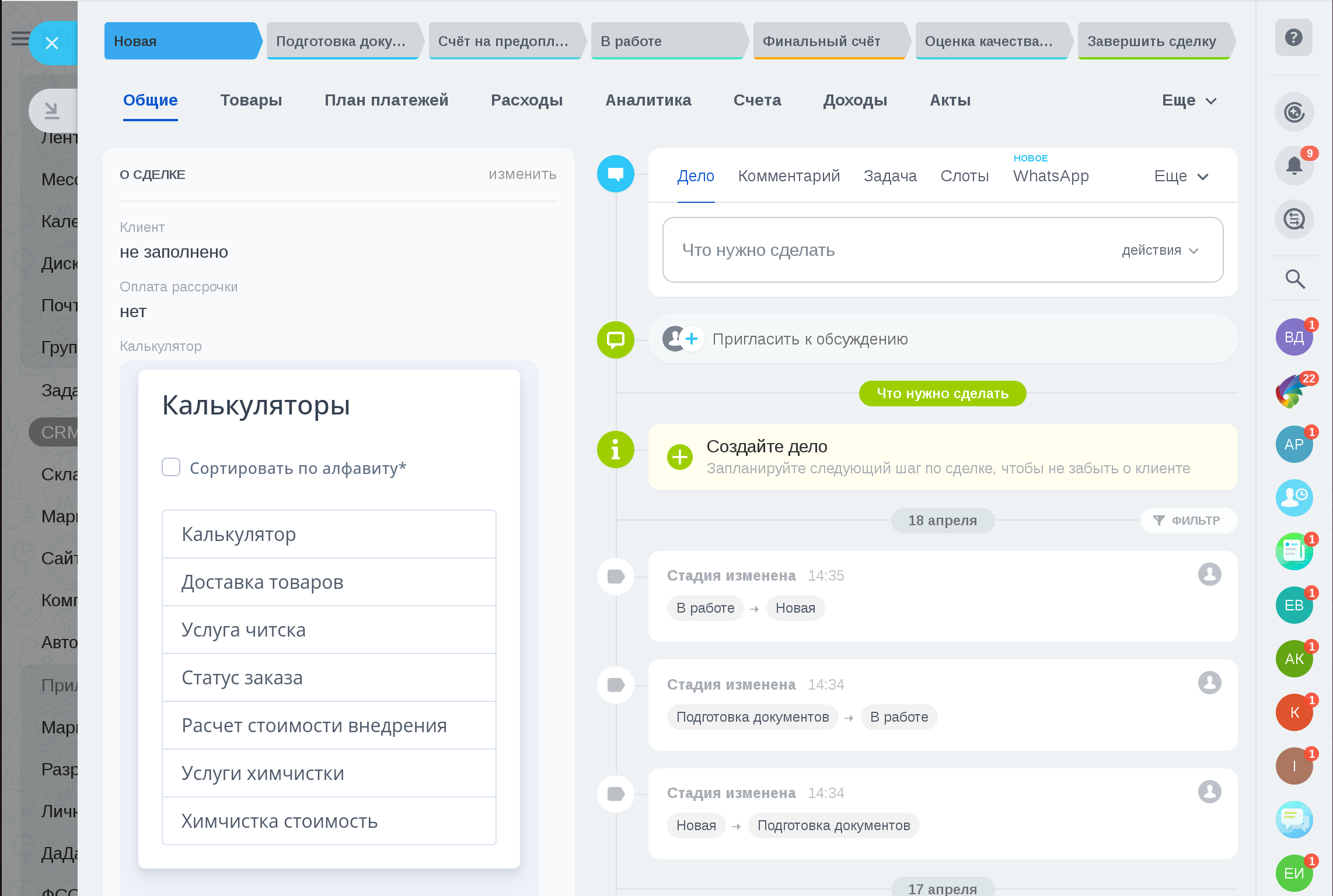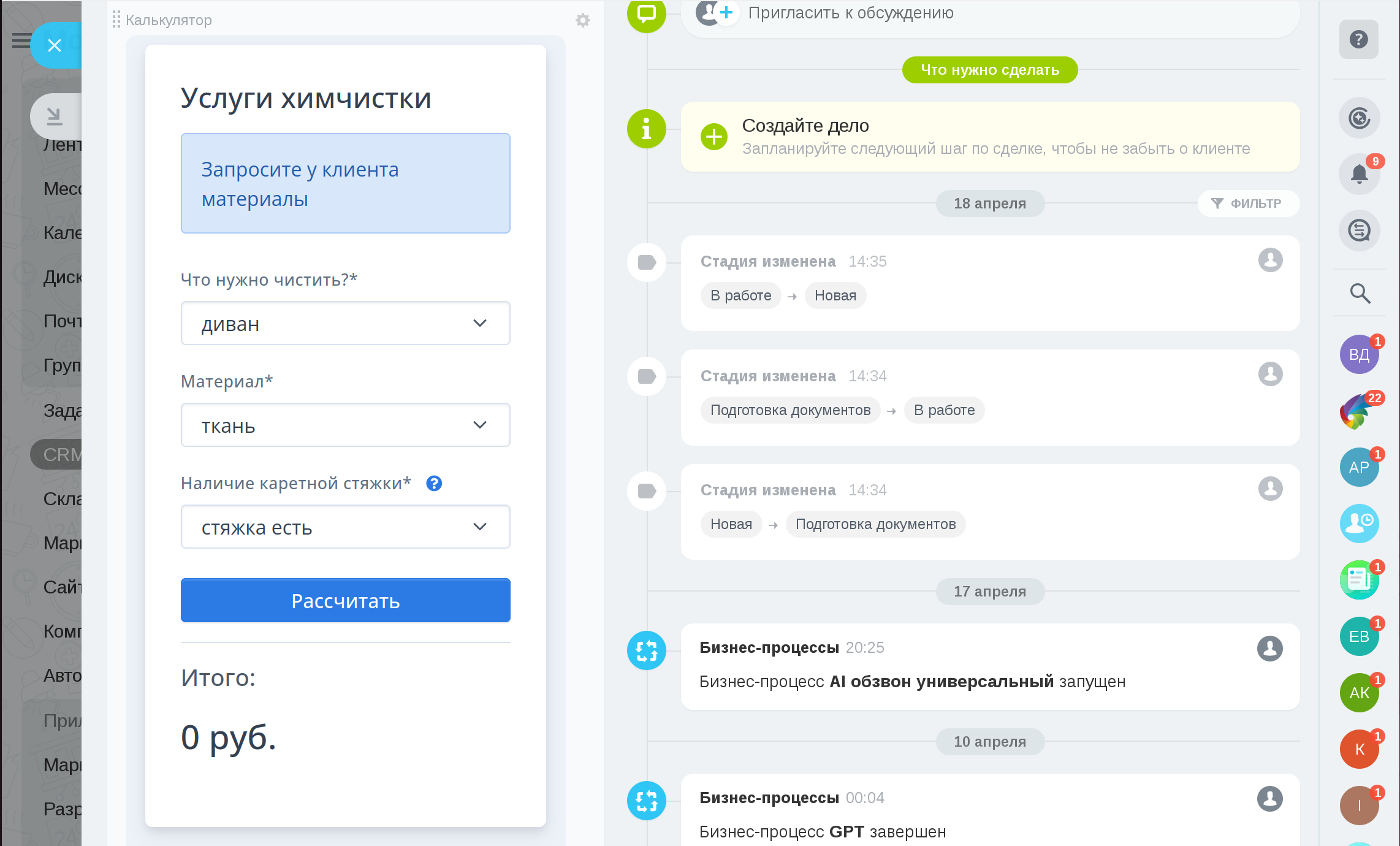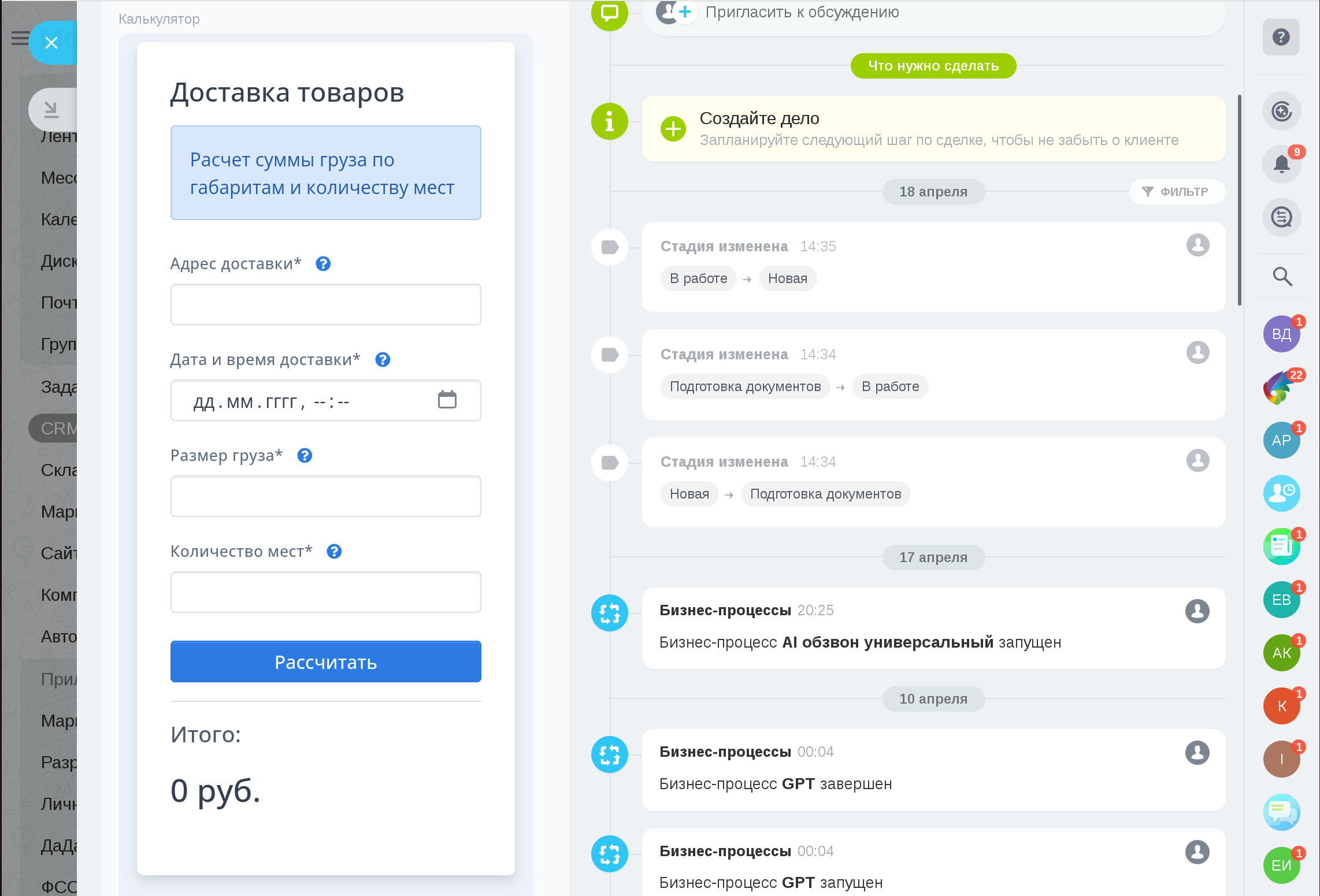 - Интеграция в CRM – все расчеты сохраняются в сделке, их можно анализировать и дорабатывать.