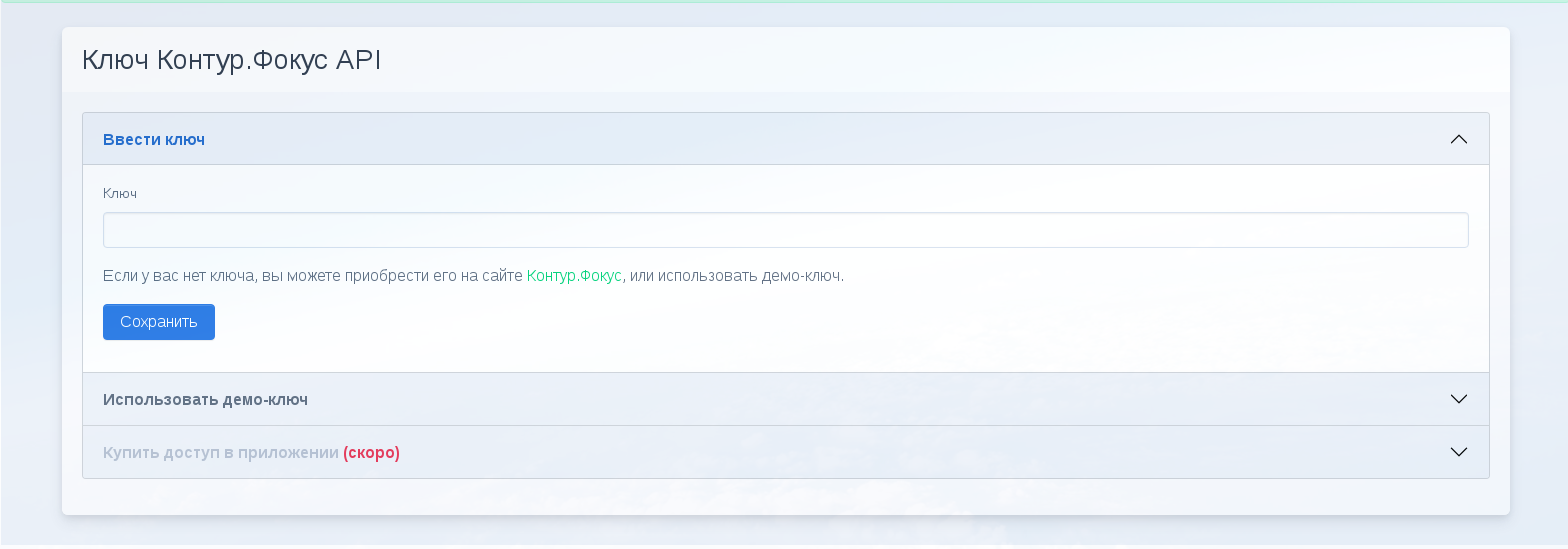 Для работы с приложением вам потребуется приобрести ключ Контур.Фокус API.