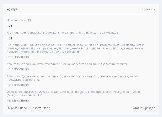 Приложение позволяет получать и сохранять информацию из Контур.Фокус прямо в карточке компании. Данные обновляются автоматически и могут быть использованы для различного рода автоматизации или визуального контроля.