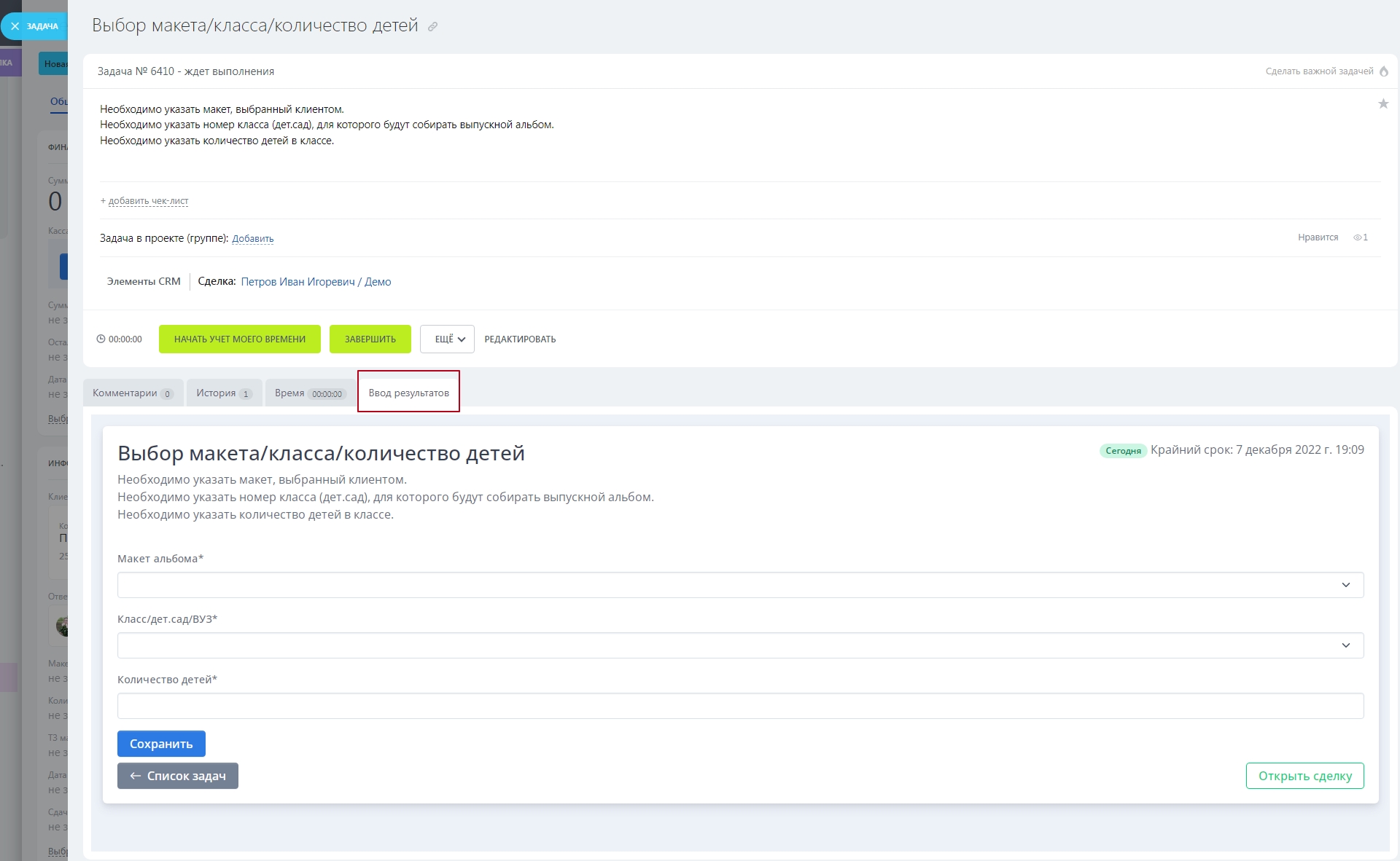 Возможность ввести в задачу результаты, которые будут сохранены прямо в поля сделки!